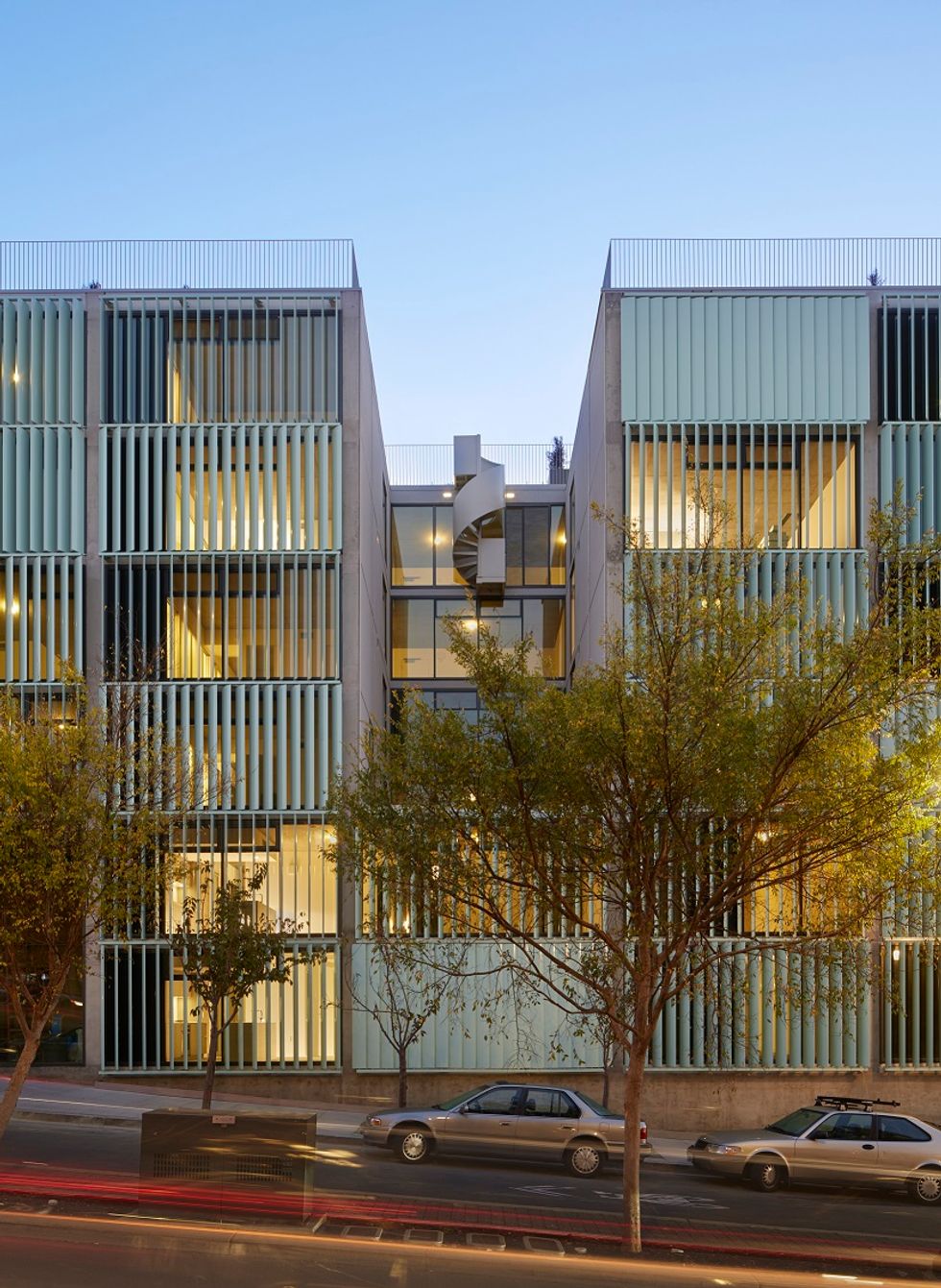Designed by San Francisco starchitect Stanley Saitowitz, the eye-catching building features a facade of slim, vertical louvers which are electronically controlled from within the individual units.