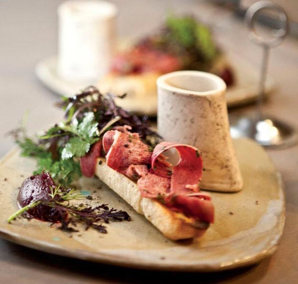 Following that, the cart might roll by with a little bowl of potato chips with horseradish crème fraîche and trout eggs. Snag it. Also get the beef tongue pastrami sandwich served with a dressing of melted bone marrow braced with vinegar, shallots, and pink peppercorns. Next to it is a dollop of sweet-sour beet puree—almost a modern-day ketchup. Glazed pork ribs with togarashi are tangy and placed on top of a pile of spigarello, an Italian green.