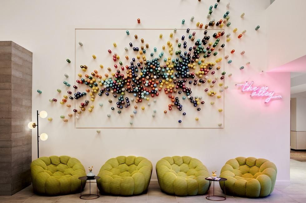 A wall of windows in the lounge opens onto Block 9, an enclosed outdoor patio named in homage to the hotel’s location on one of the original 10 blocks that formed the city of San Francisco. Set with two long communal fire pits and blue and chartreuse wingback chairs, and strung with cafe lights, the courtyard is a sanctuary in the SoMa hustle. In the Parklet (which is not actually a parklet but an event space), there’s a bright etherealist mural by East Bay juggernaut Hueman.
