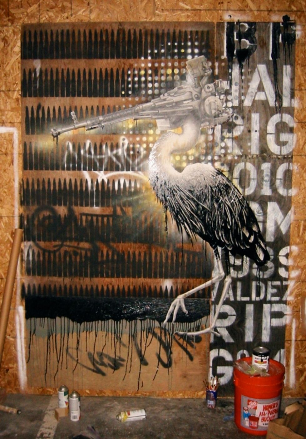 If you've passed by the SFMOMA's Garage street-level windows on Natoma and Minna lately, you've probably noticed a pretty scary looking bird installation staring out at you. The piece's got impact, and it's by prolific street artist Jesse Hazelip, who is also currently showing at 941 Geary (the newest gallery from Justin Giarla of White Walls and Shooting Gallery) through August 24. The heron, who's sporting a machine gun as a head, is a commentary on both capitalism and greed as it relates to the BP oil spill.