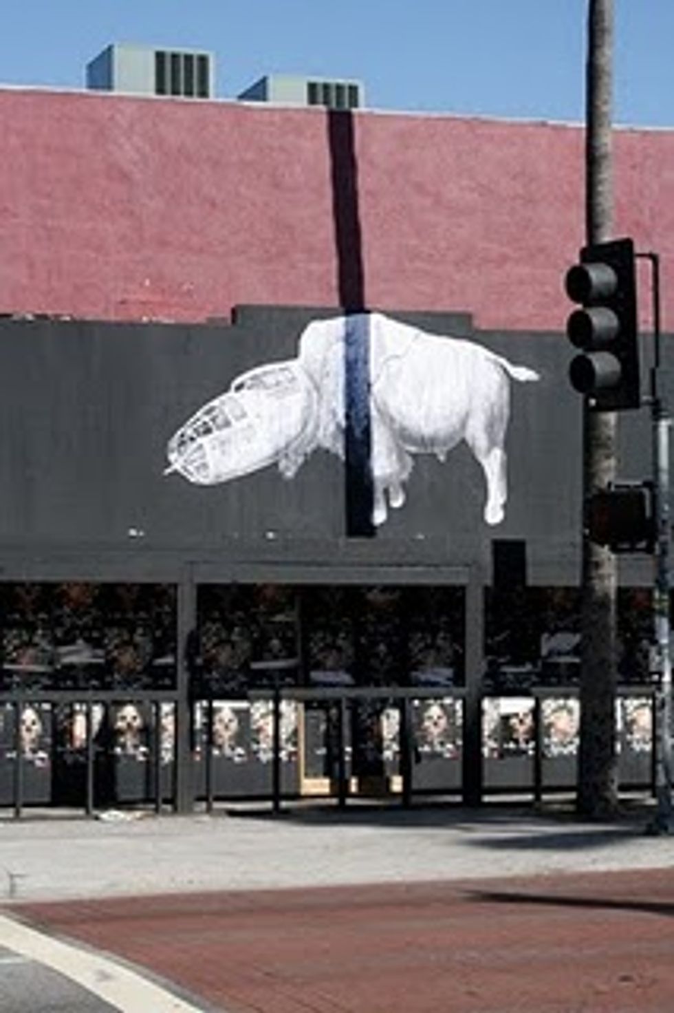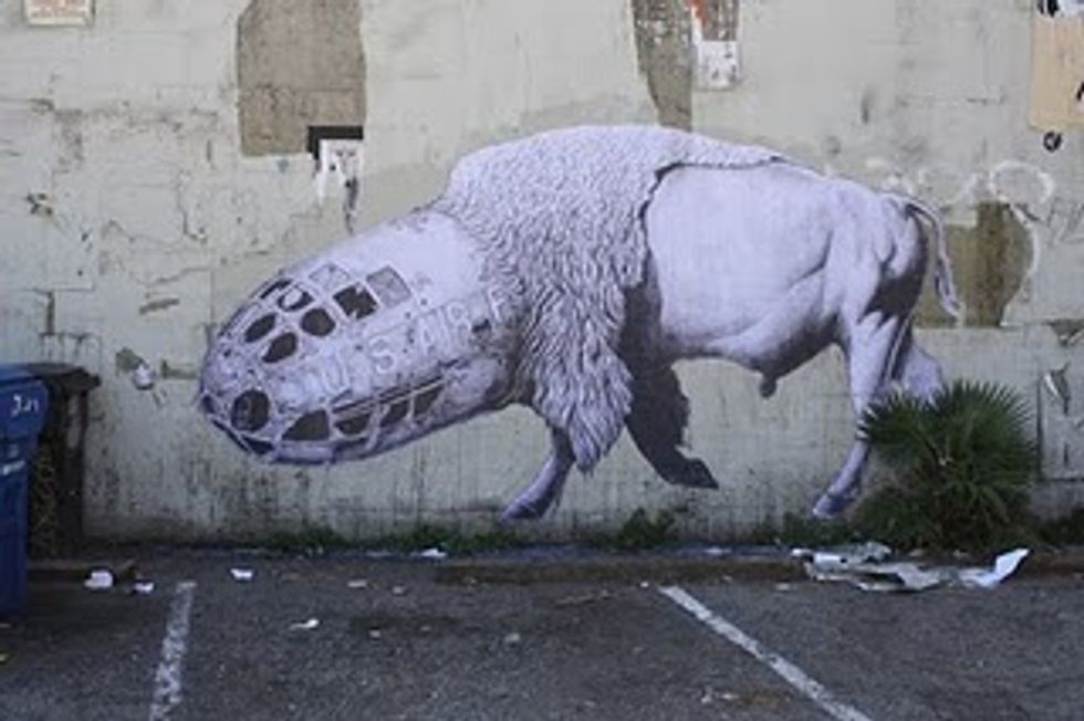 Hazelip's all about melding together incongruous iconic imagery to confront the military industrial complex. You may have seen his WWII-weaponry-headed buffalo on the streets of Berkeley or LA. It's pretty show-stopping.
