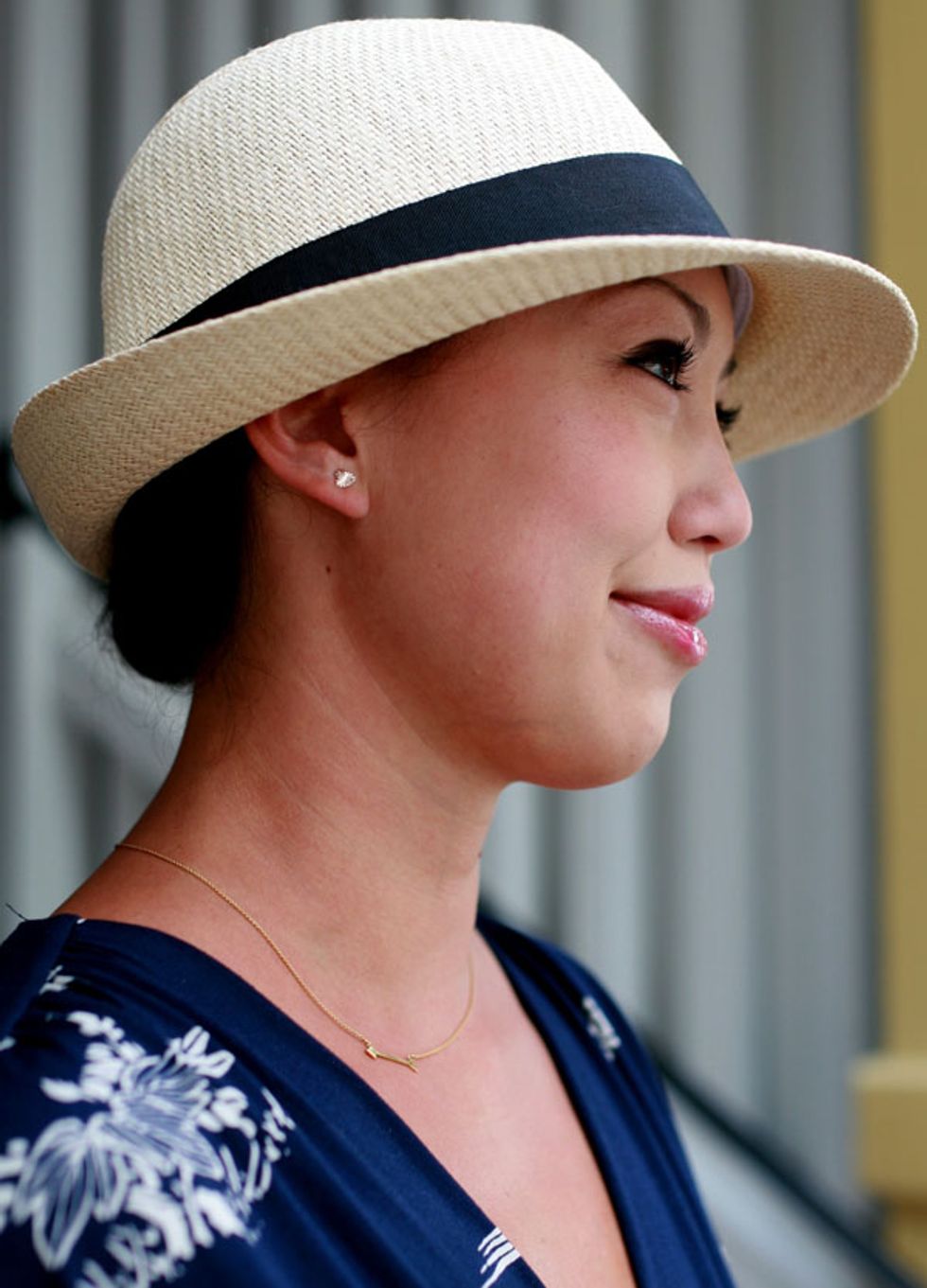 What She Wore: Nanette Lepore romper, purchased at Anthropologie; Unknown fedora, purchased on her last trip to Hawaii; DV by Dolce Vita leather wedges, purchased from Nordstrom; Stella & Dot necklace; Steven Alan heart earrings; Michael Kors watch, assorted rings and bracelets.