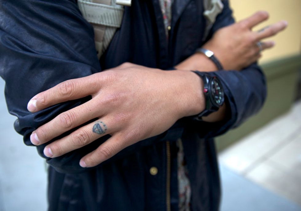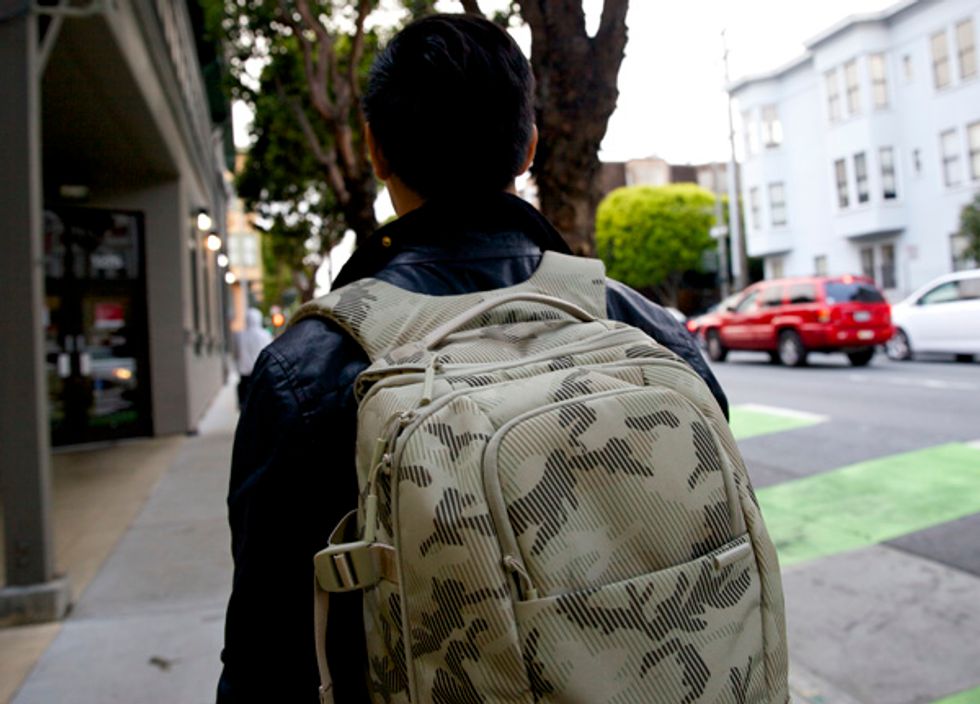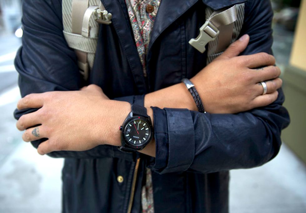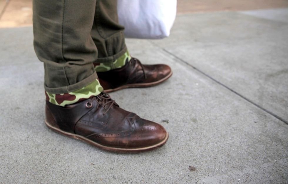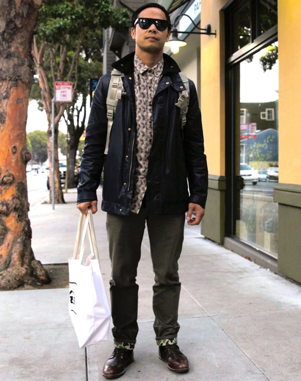 What he wore: Retrosuperfuture sunglasses; Obey button-down shirt, purchased from Urban Outfitters; Filippa K jacket, purchased from Wasteland; Incase camo-print backpack; Goodale NYC pants, purchased from Jack Threads; REI canvas tote; Tsubo leather boots, purchased from Gianpaolo Altomari; Ring made from 1982 quarter, gift; Nixon watch, purchased from Base, Miami; Diamond ring tattoo from a parol on Haight Street; Haircut from Rudy's LA.