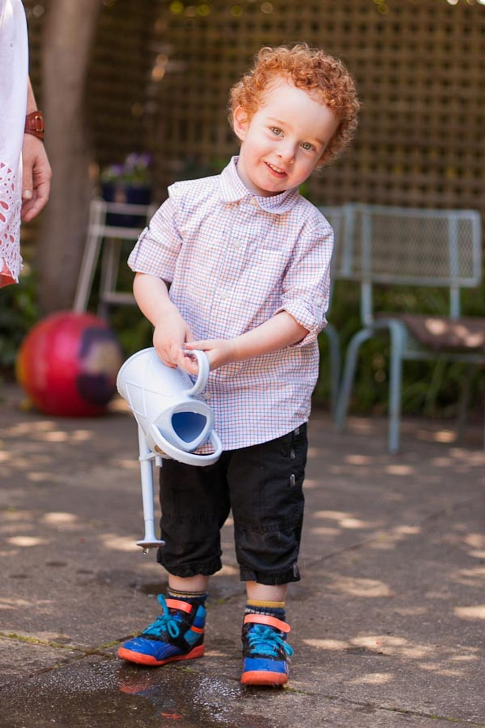 What he's wearing: Plaid shirt from Janie and Jack; Black pants from H&M; Osh Gosh striped socks from Target; Reebok neon sneakers, hand-me-downs from local artist MARS-1 (Mario Martinez) and family; Haircut by Kelly Tunstall; Watering can from Ok in LA.