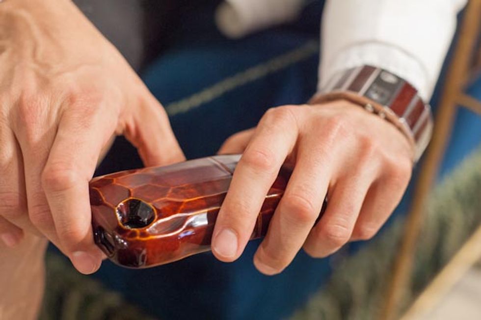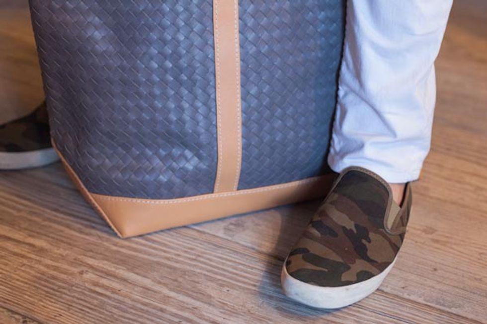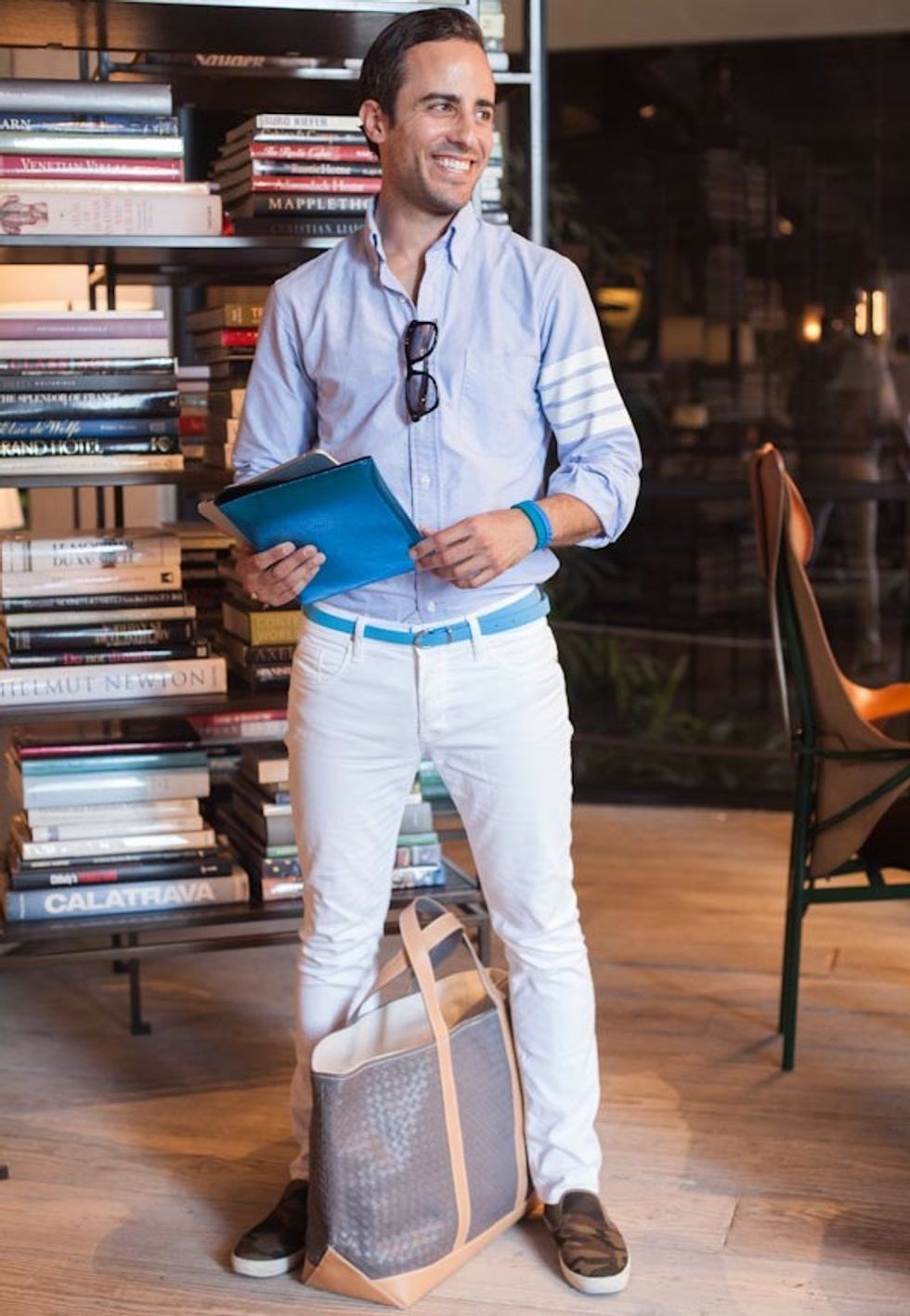 What he wore: Thom Browne shirt, purchased from Barneys; H&M skinny belt; Hudson pants and SeaVees camo-print sneakers, both purchased from Bloomingdale's; Marc by Marc Jacobs sunglasses and rubber bracelets; Burberry Prorsum metallic leather iPad case; Lance Wovens bag, purchased from Cavalier.