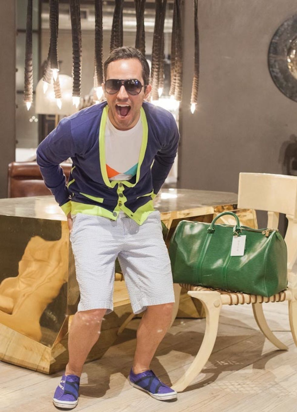 What he wore: Marc by Marc Jacobs sunglasses and cardigan; Saturdays Surf NYC t-shirt; J. Crew seersucker shorts; Tretorn sneakers, purchased from Bloomingdale's; Louis Vuitton bag with personal luggage tag.