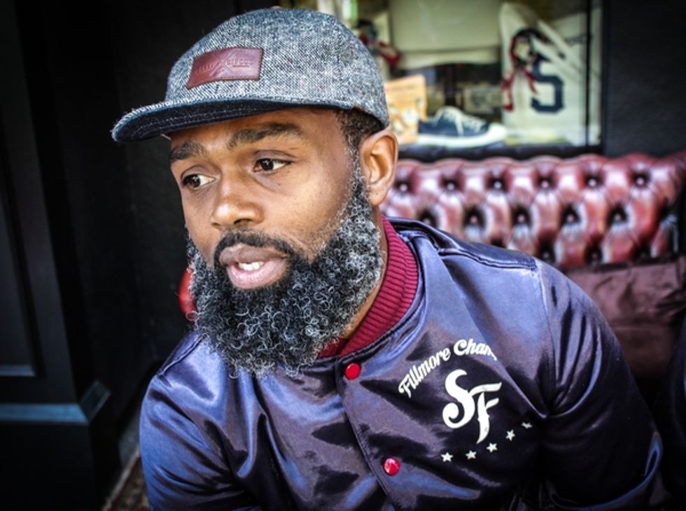 Ouigi Theodore, creative director of The Brooklyn Circus, rocking the very appropriate BKc "Fillmore Champs SF" jacket.
