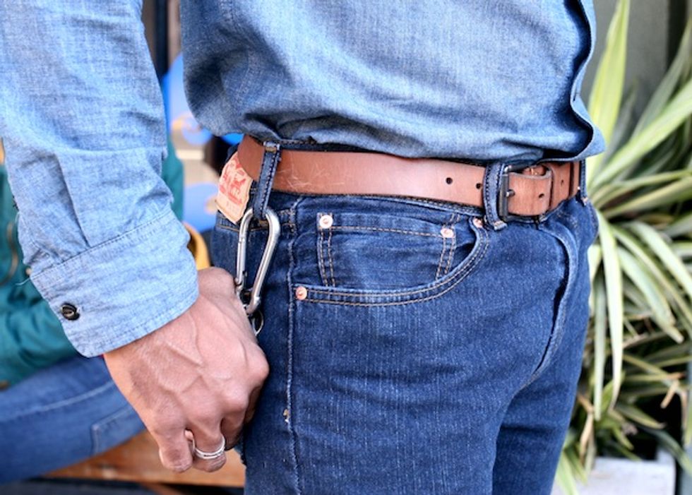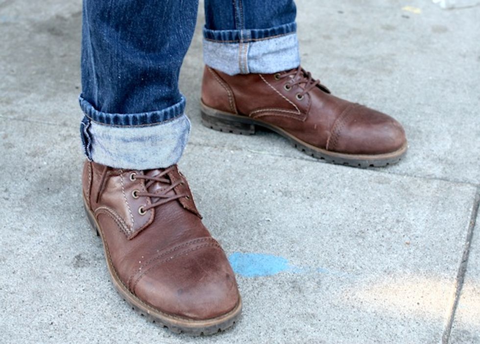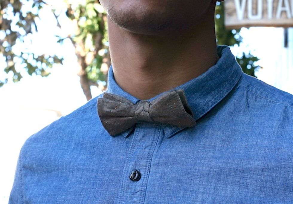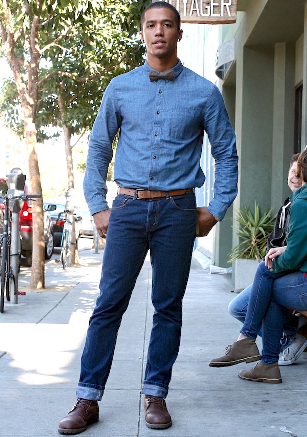 A simple leather belt, boots, and denim-on-denim are staples of classic workwear. But with the right fit, a neatly tucked in shirt, and a crisp bow-tie, this look is instantly elevated to handsome and hip street wear. Nicely done.