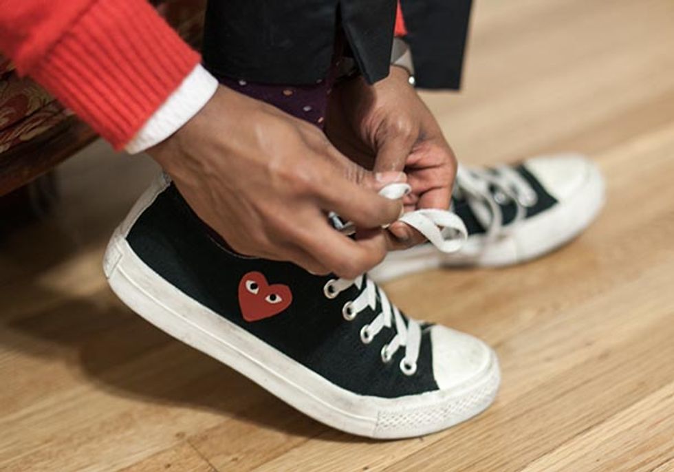 Modern Mr. Rogers: White button-down shirt, from American Apparel; Topman floral tie; Vintage red cardigan, purchased from Wasteland; Black pants from H&M; Uniqlo polka-dotted socks; Comme des Garcon for Converse sneakers, purchased from Shotwell; Burberry watch; Apple iPad.