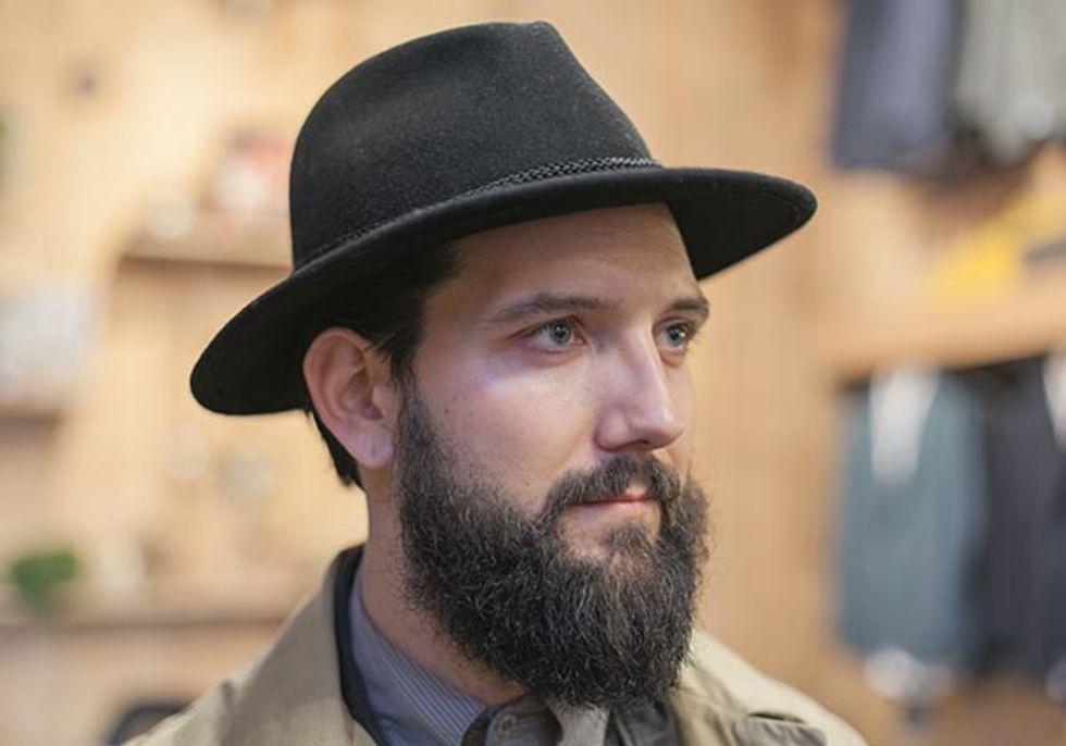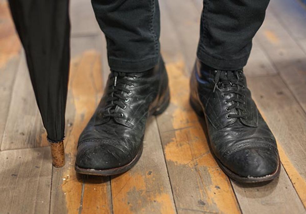 What he wore: No label hat; RVCA button-down shirt and skinny pants; Levi's denim vest; Freemans Sporting Club raincoat; ML Brown leather belt, purchased from Taylor Stitch; Stacy Adams leather oxfords; Leighton umbrella, purchased from Amazon; Tattoos by Angelique Sanders at Flesh Company in Maryland; Hair by Audra Cutler at FSC Barber; Beard grooming by Dan Diemidio at FSC Barber.