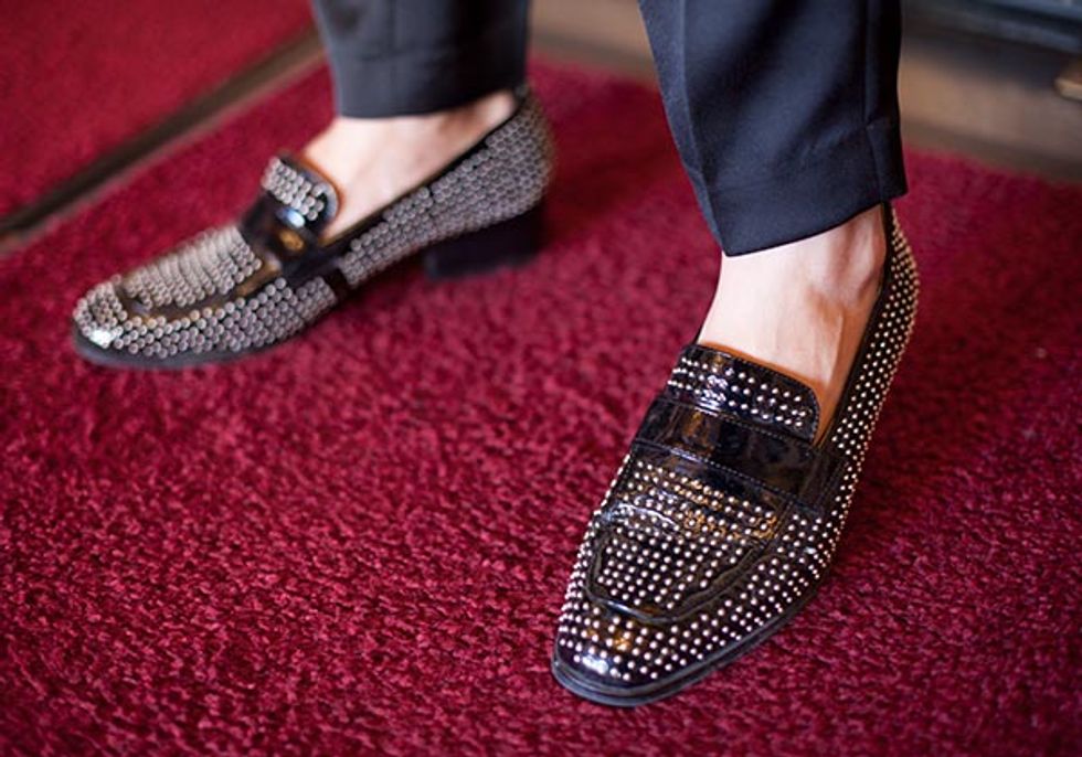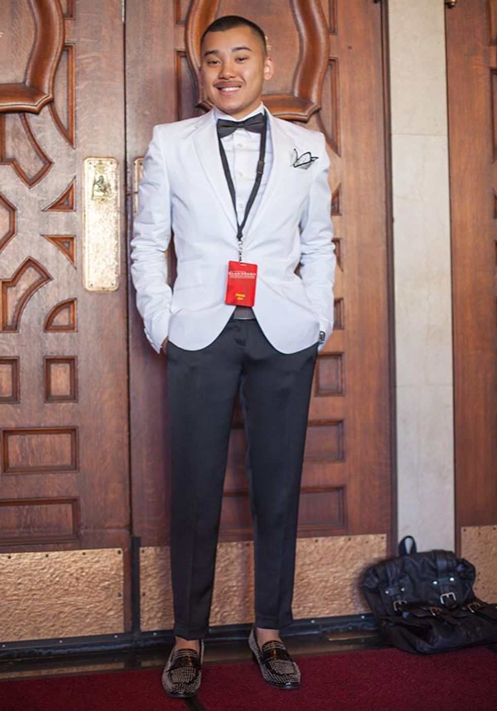 What Bryan Wore: White dress shirt, silk pocket square and tuxedo pants from Express; Burberry bow-tie by Bloomingdale's; White jacket from H&M; Zara belt; Michael Kors watch; Aldo studded loafers and backpack.