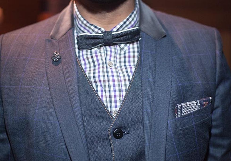 What Gautam Wore: Check shirt, jacket, lapel pin and belt by Ted Baker; Self-designed Gautam Collection denim and white trim bow-tie and pocket square; Black Levi's pants; Leather oxfords with purple laces by Ted Baker; Glasses by Ray-Ban.