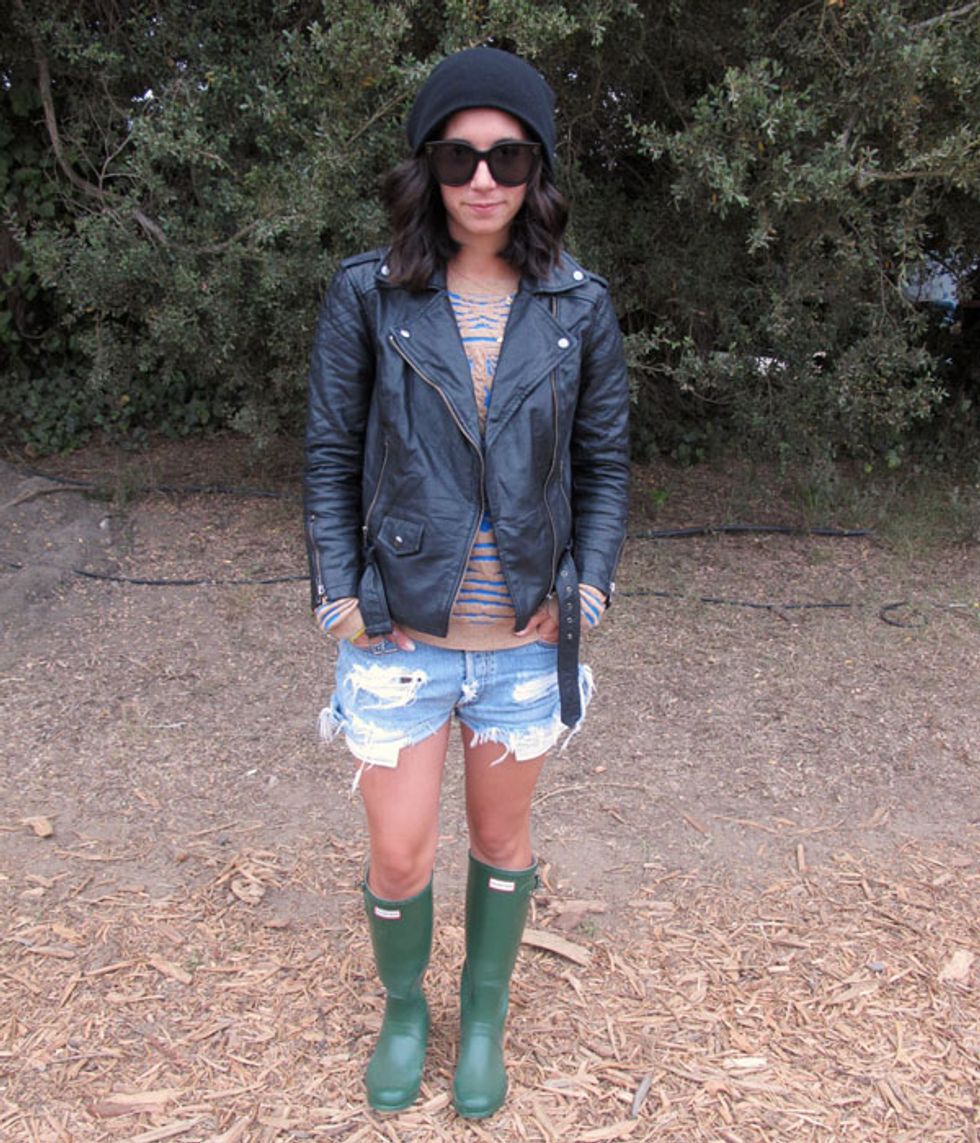 What Krystal wore: ASOS beanie, jacket and sweater; Levi's shorts; Hunter wellies; Céline sunglasses