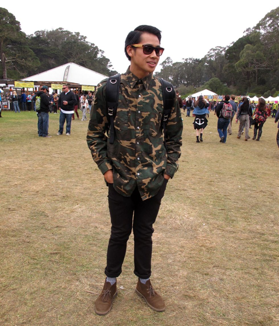San Jose State University student (and Kaskade lover) Eric Pena Jr. pulled off urban camouflage prints in a polished way.