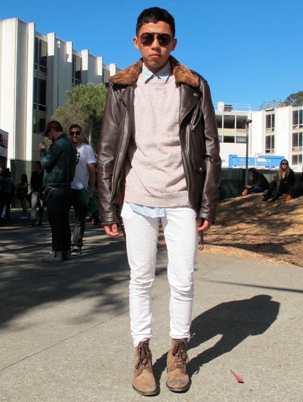 What Emil wore: APC leather jacket; Cheap Monday white denim skinny jeans; Vintage chambray shirt; To Boot New York boots; Tom Ford aviator sunglasses.