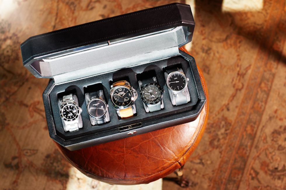 His collection also includes (from left to right) Rolex Submariner, Frederique Constant Slimline Automatic, Panerai Luminor 1950 Power Reserve, Edox Ice Shark II, and Botta Uno Date Automatic.
