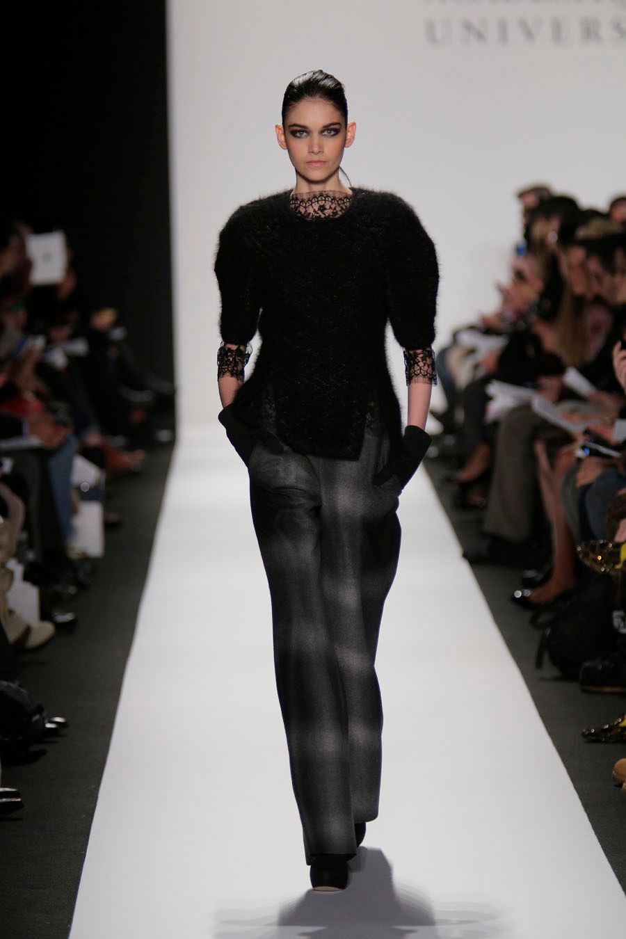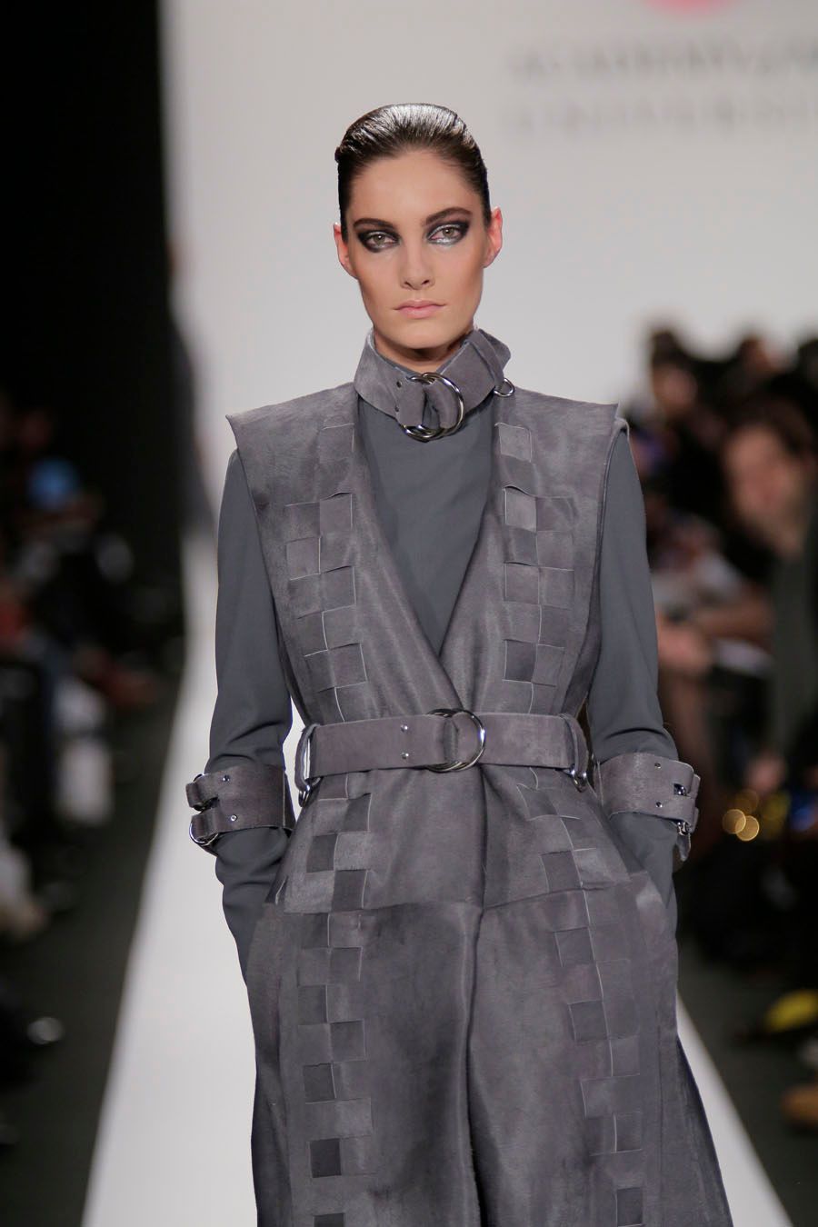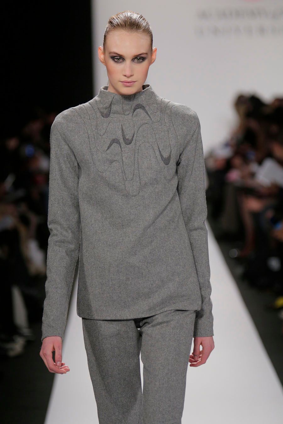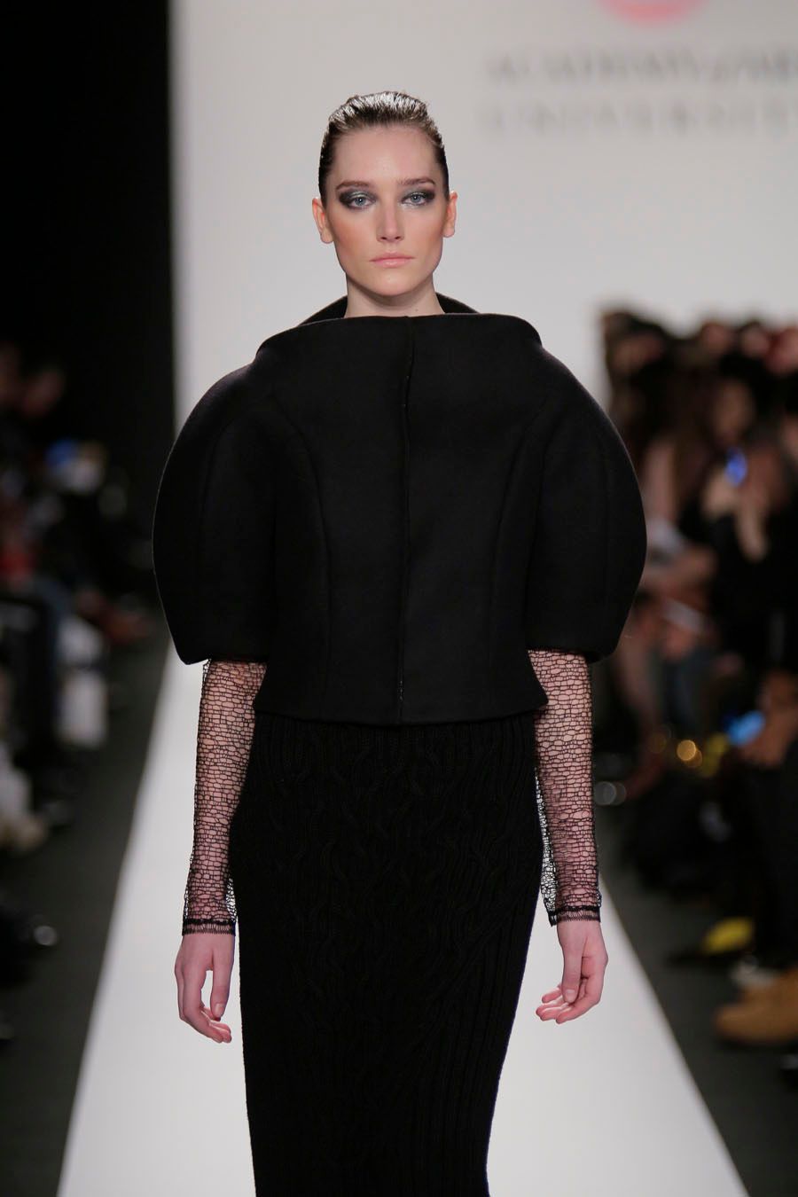 The relationship between humans and technology was the inspiration for Heather McDonald who drew on the 1927 Film Metropolis for her collection. The dark pieces focused on an angular silhouette, highlighted by sheer and structured layers as well as contoured knitwear pieces. The pieces evoked a dark contrast between sharp and soft, warm and cool, natural and unnatural.