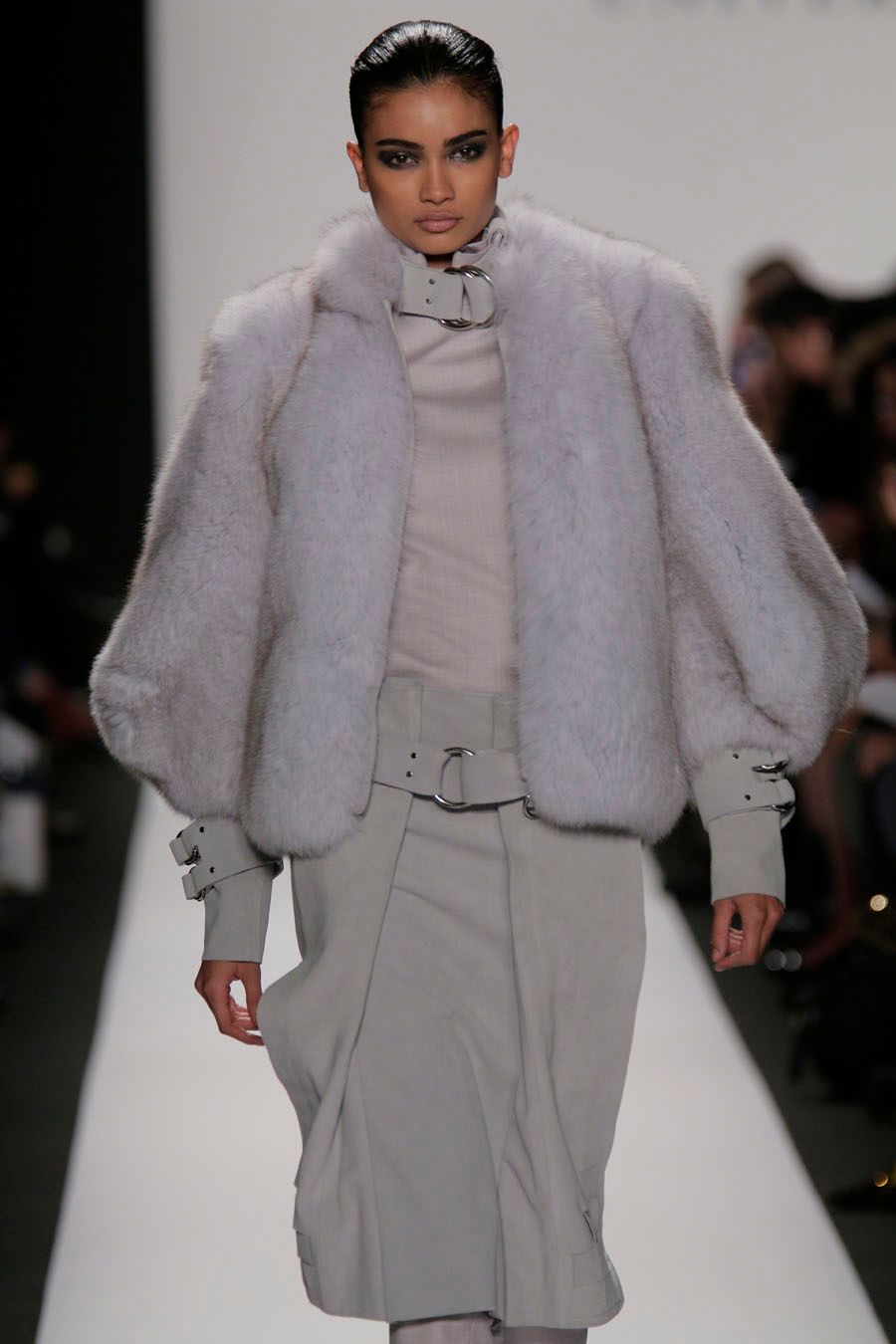 The final designer Qian Xie kept a decidedly simple palette, playing with the ideas of light, shadow and negative space. Inspired by the shadows created during different times of day, Xie paired the texture and bulk of buckles, fur, latticed leather to emphasize the play of texture and space.