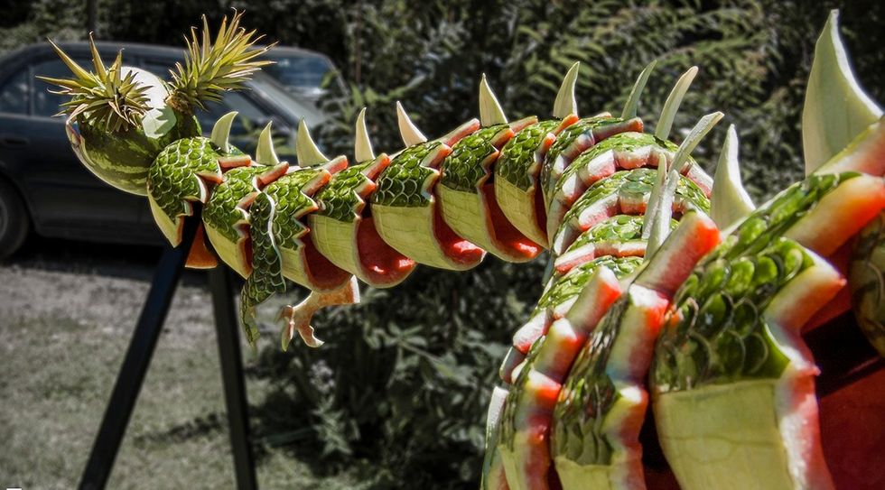 Shawn Feeney: Feeney says his super inventive watermelon dragon sculpture was "inspired by the current Chinese Year of the Water Dragon." It is made of 14 watermelons (plus two Fiji pineapples for the horns). See more of his carvings here.