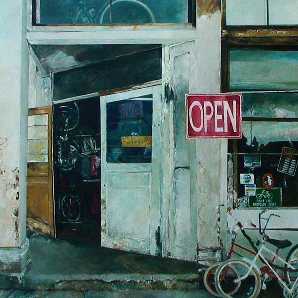 Kirt Hardcastle: Sonoma-based Hardcastle has been painting for over 30 years, and has amassed hunreds of works. Though not currently represented his work has been shown and sold in several galleries in California through out the years. This particular painting was done of an open bike shop in San Jose, California. Click here to see more of his works. Click here to view his Etsy shop.