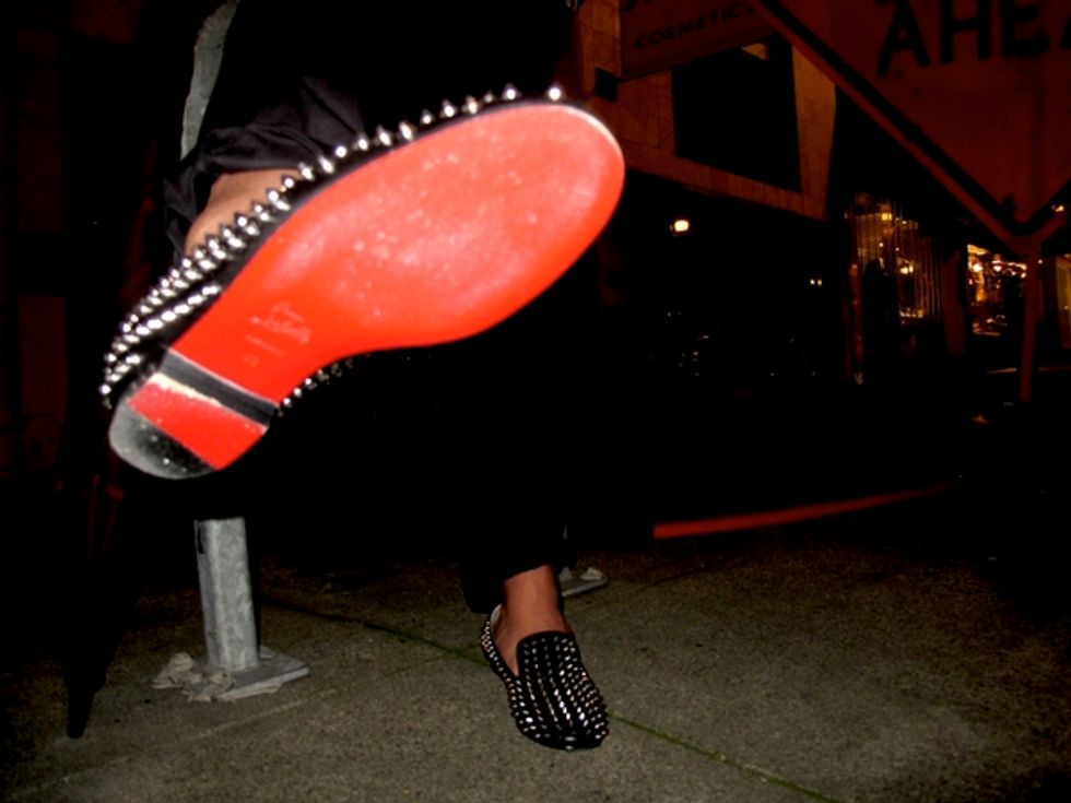 What he's wearing: Woolrich chambray shirt, Never Sleep cardigan from Urban Outfitters, Stephen Sprouse for Louis Vuitton graffiti necktie, Prada pin, Cartier Santos watch, Hyden Yoo pants from Carey Lane, Christian Louboutin spiked shoes, Burberry umbrella.
