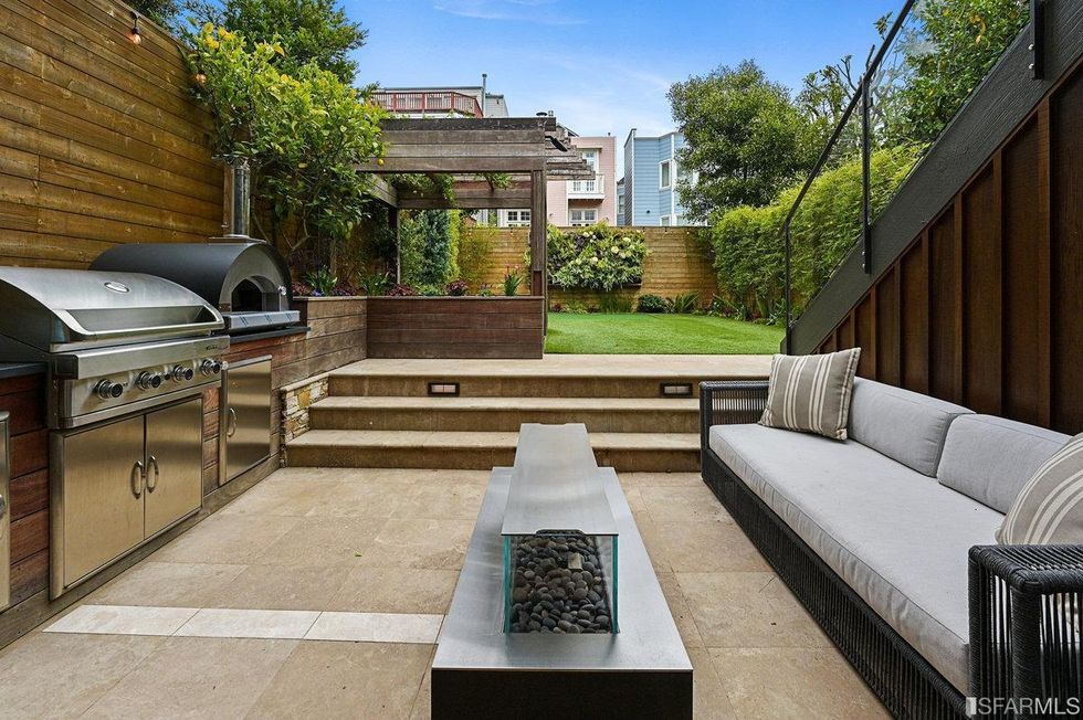 Ideal for entertaining, the backyard as an outdoor kitchen with a built-in barbecue, Forno Toscano pizza oven, a fire pit, sound, and overhead electric heaters.