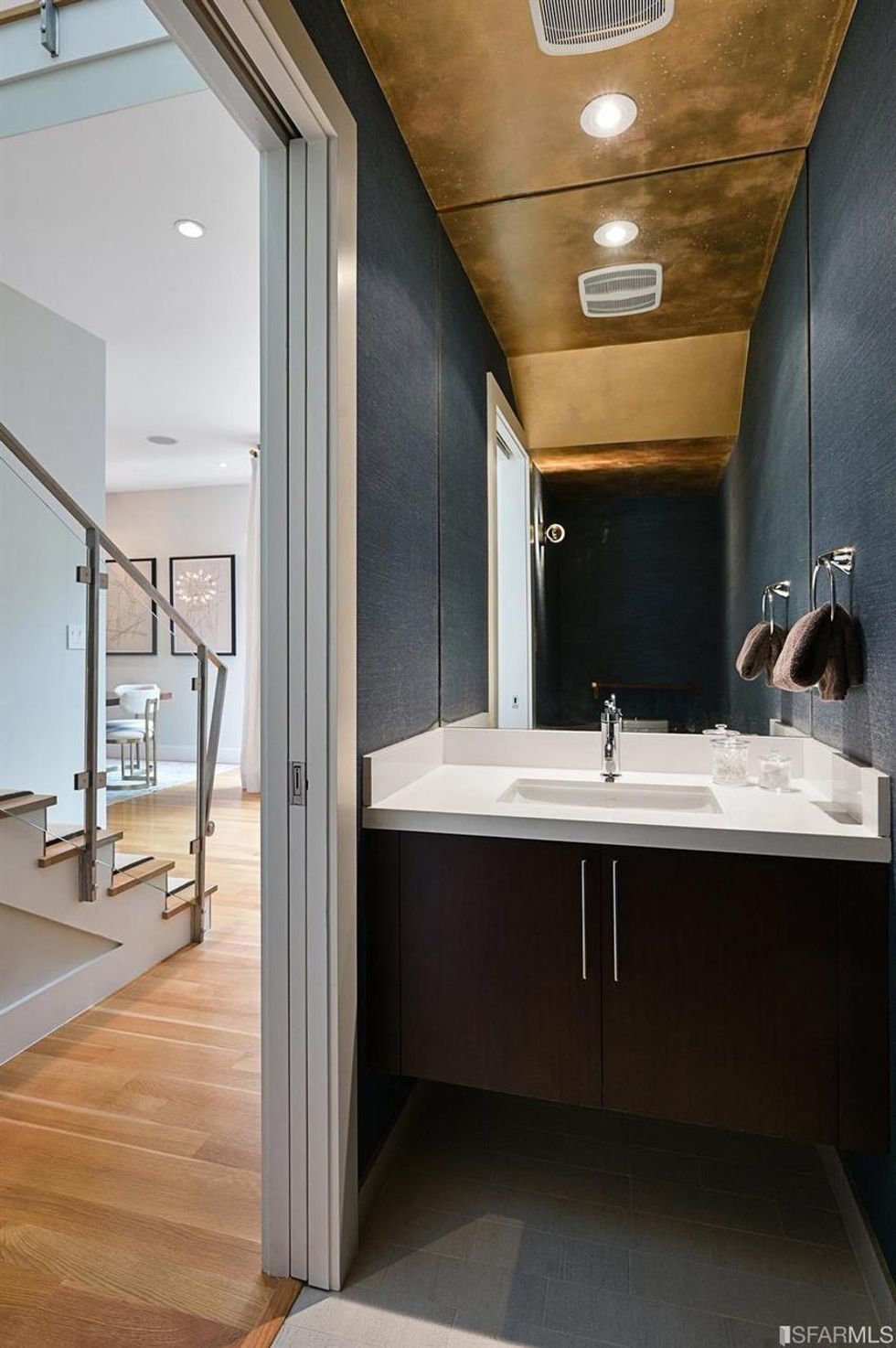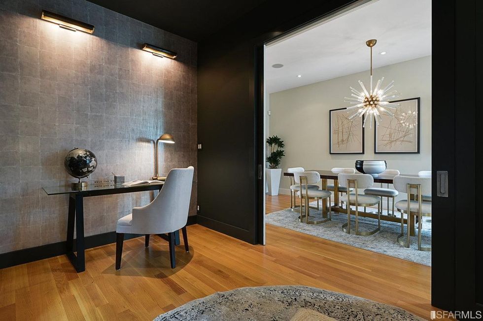 An open foyer leads into the living room with oversized west-facing windows, a floating gas fireplace, and built-in shelving. The foyer makes for efficient coming and going with a coat closet, an additional closet beneath the staircase, and a powder room swathed in blue seagrass wallpaper and crowned with a metallic-painted ceiling. This little room provides the perfect transition into the formal dining room where a dramatic, starburst chandelier and adjacent moody den, illuminated by brass sconces and a textured accent wall, have sexy, intimate vibes.