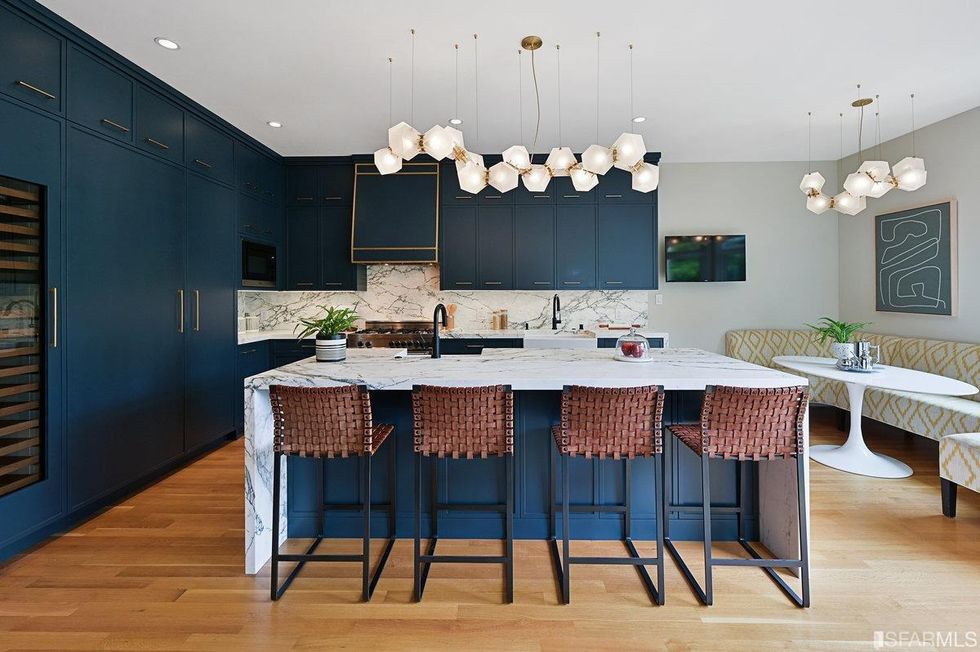 The kitchen is striking, painted in a deep blue with brass pulls, veined marble countertops, and slab backsplash. The central island with a waterfall edge has plenty of prep space, a mini fridge, and seating for informal dining. Chefs will delight in the Bertazzoni six-burner range and custom hood. Additional amenities include an extra-large Subzero refrigerator, a wine fridge, dual Shaw's sinks, and a Bosch dishwasher. Dry goods can be stored in the large walk-in pantry. A sunny breakfast area has a built-in banquette, while a sliding door provides access to al fresco meals on the deck overlooking the garden.