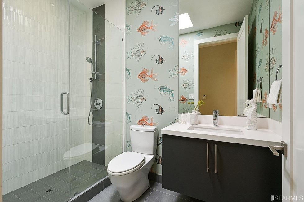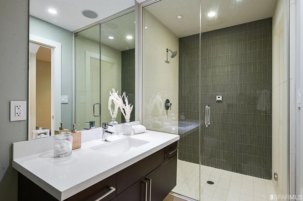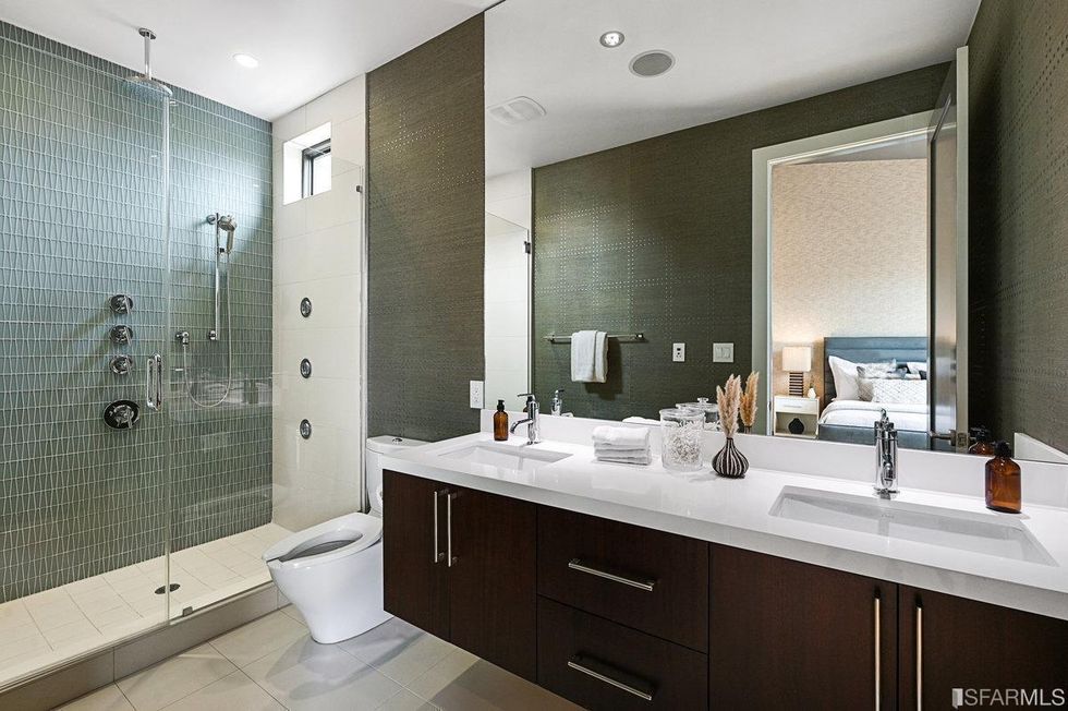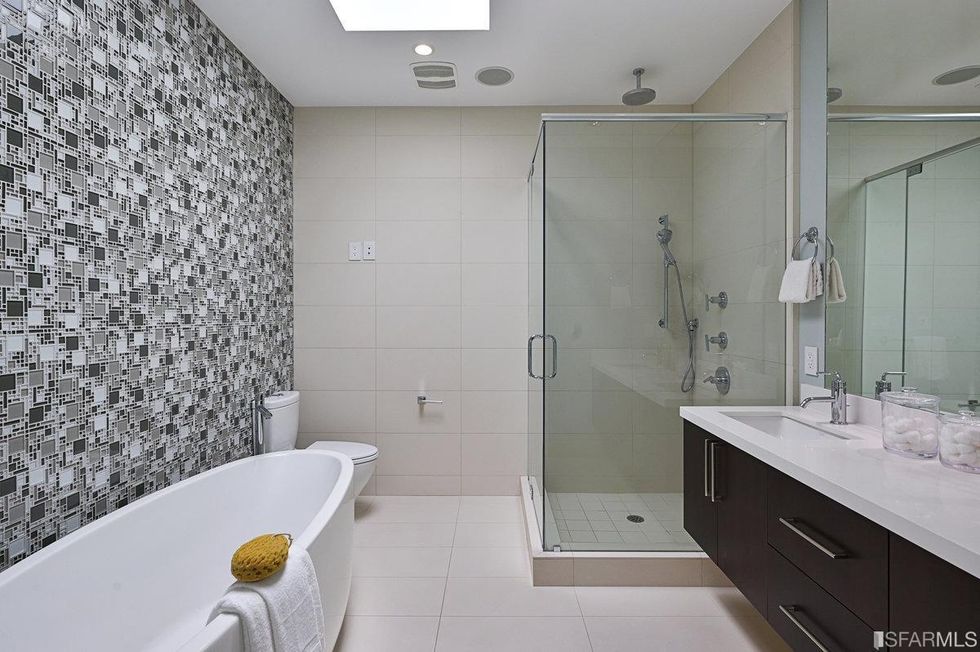 On the upper level, there are four bedrooms, three bathrooms, and a laundry room. The primary suite has extra large windows, double closets, and a spacious master bath with a floating dul vanity, glass-enclosed rain shower, and soaking tub beneath a skylight. Mosaic tile accents here add an artsy touch.