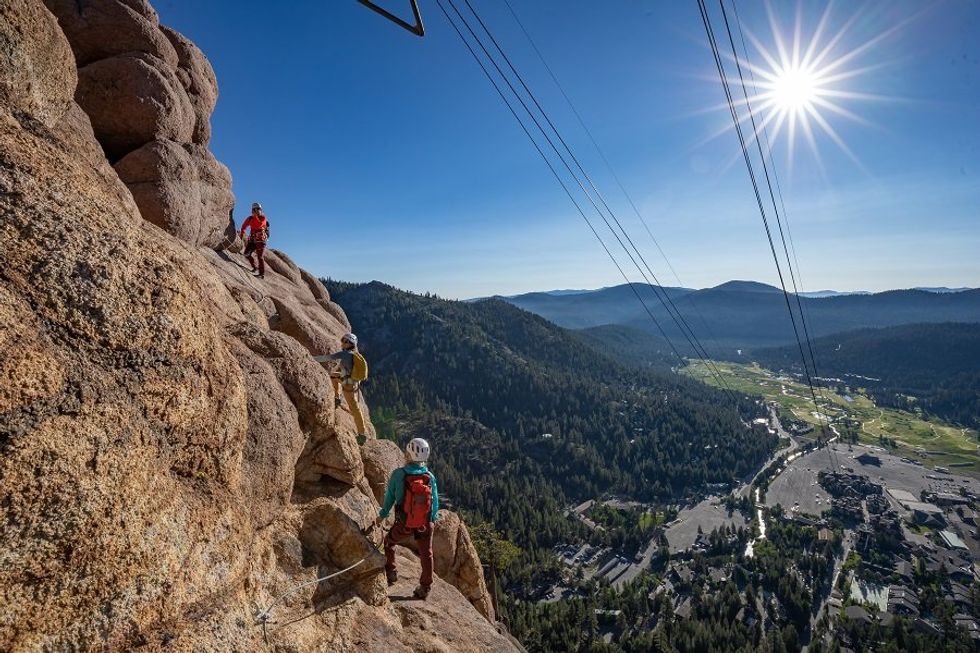 You don’t have to have rock climbing experience to take on this dizzying adventure at Palisades Tahoe. On Alpenglow Expeditions’ Tahoe Via Ferrata—a mountaineering route made up of iron ladder rungs, steel steps, and suspended crossings that span the steep Sierra Nevada terrain—a harness attached to a steel cable keeps you safe at all times. The European sport is, nevertheless, an adventure not for the faint of heart. Over a two-, three- or four-hour tour, you’ll cling to vertical cliffs, cross impassable rock faces, and step onto bridges swaying hundreds of feet above the earth. It has none of the danger of rock climbing, but just try convincing your brain that there’s nothing to fear.