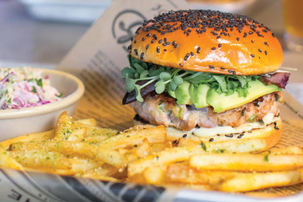 It's served in a decidedly West Coast style, giving a nod to summer fish burgers but presenting them through a Hawaiian lens. It comes on a black sesame bun with wasabi aioli, daikon sprouts, and pickled ginger. Alongside are skin-on furikake fries and a colorful sesame slaw.