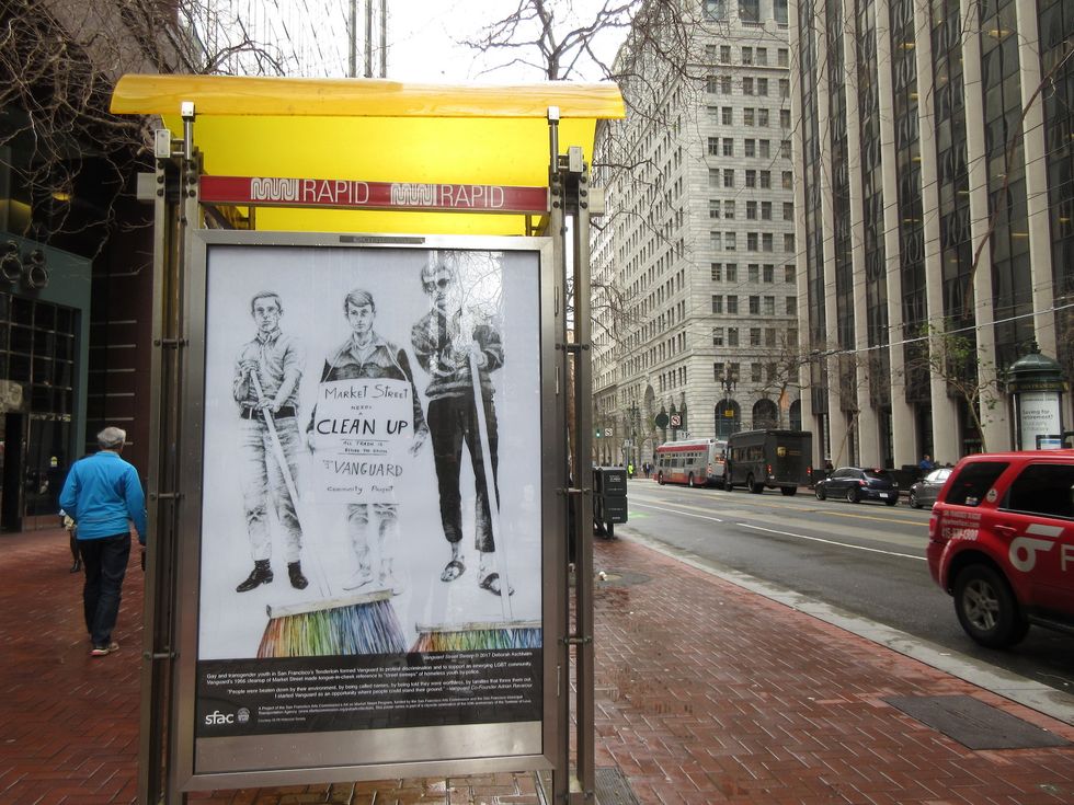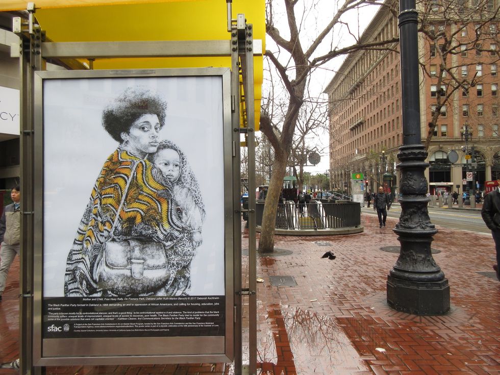 From now through May 12, 2017, pedestrians along Market Street will see scenes that recall the 1967 Spring Mobilization, the Vietnam War, and the Human Be-In, alongside portraits of individuals including City Lights Books founder Lawrence Ferlinghetti. Each image is contextualized by a caption: A drawing of a Black Panther woman is accompanied by a quote from famous Panther member Kathleen Cleaver.