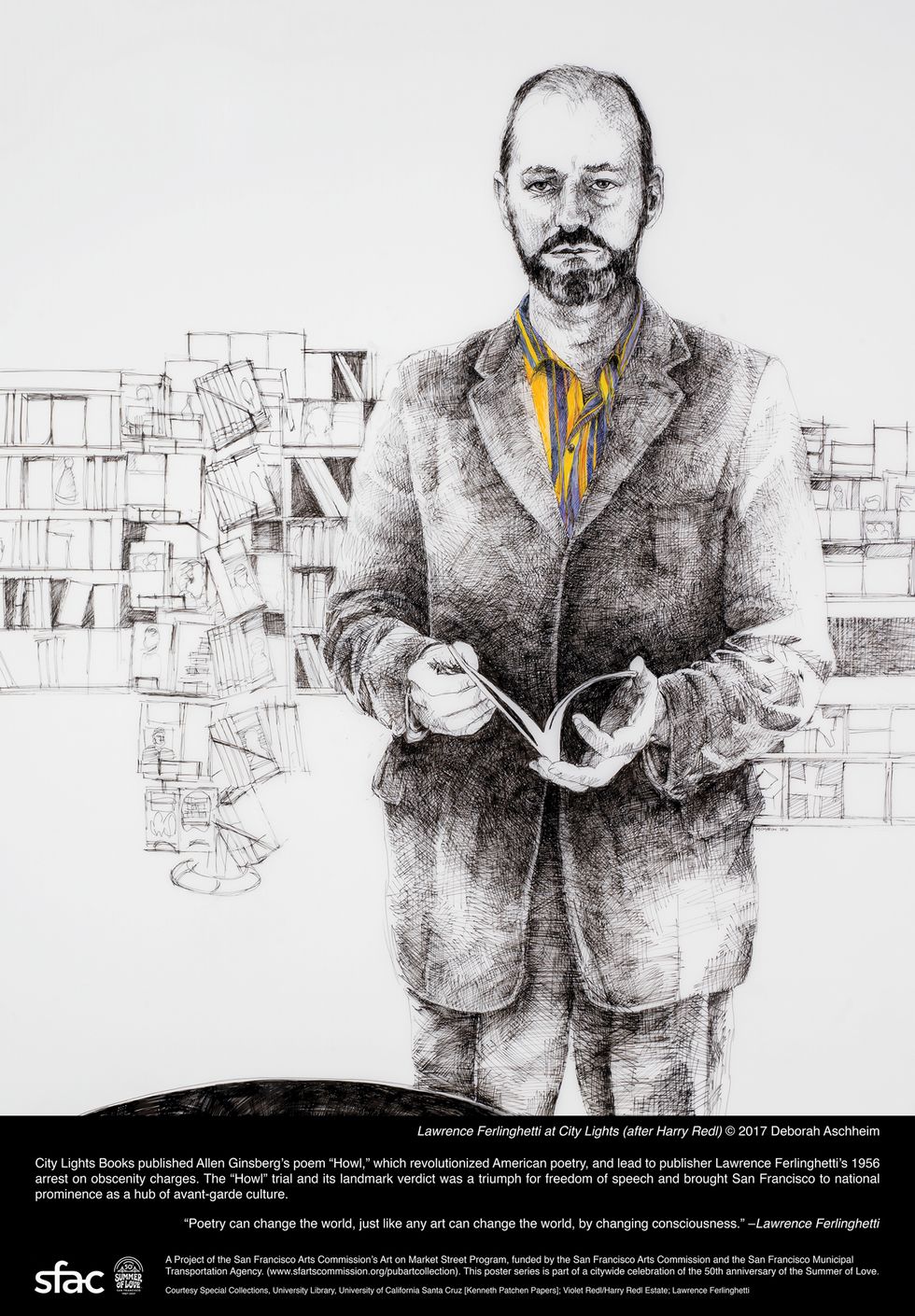 As part of a series of celebrations leading up to this summer, the San Francisco Arts Commission asked three local artists to examine the historic season of revolution through a contemporary lens for its popular Art on Market Street Poster Series. The first in the series, The Zeitgeist by Deborah Aschheim, highlights some of the people and events that defined 1967 through highly detailed pen and ink drawings.
