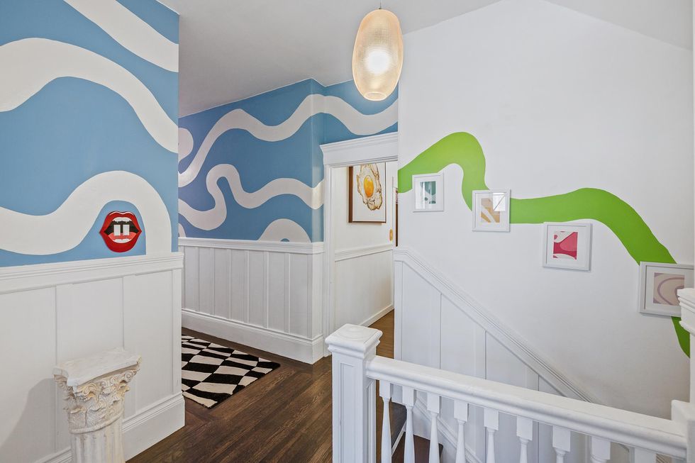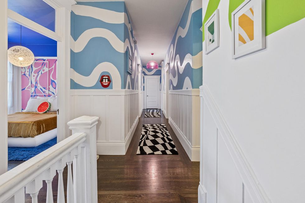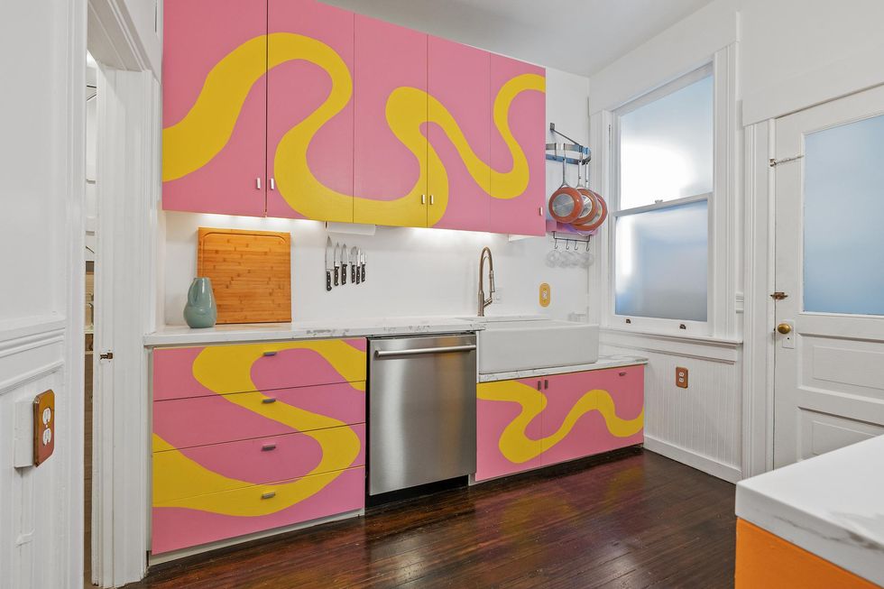 The stair and hallway walls undulate in shades of teal and neon green squiggles, while lemony swirls dance over flamingo-pink cabinets in the kitchen where the island is painted a bright tangerine.