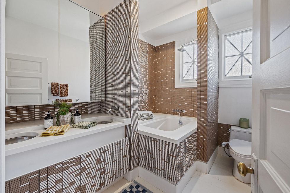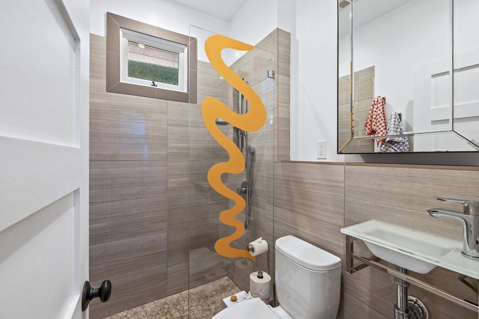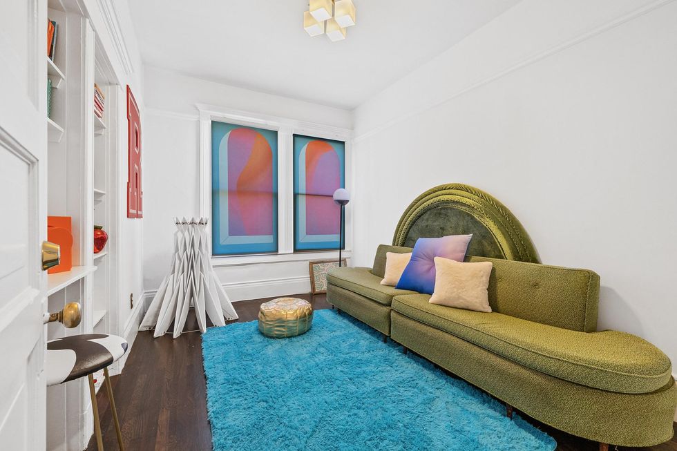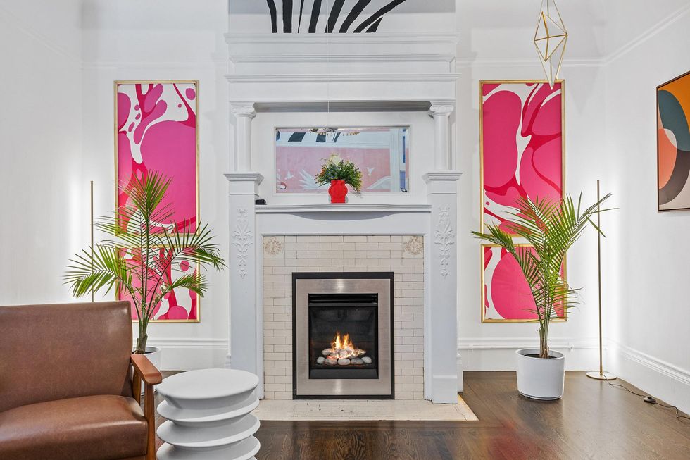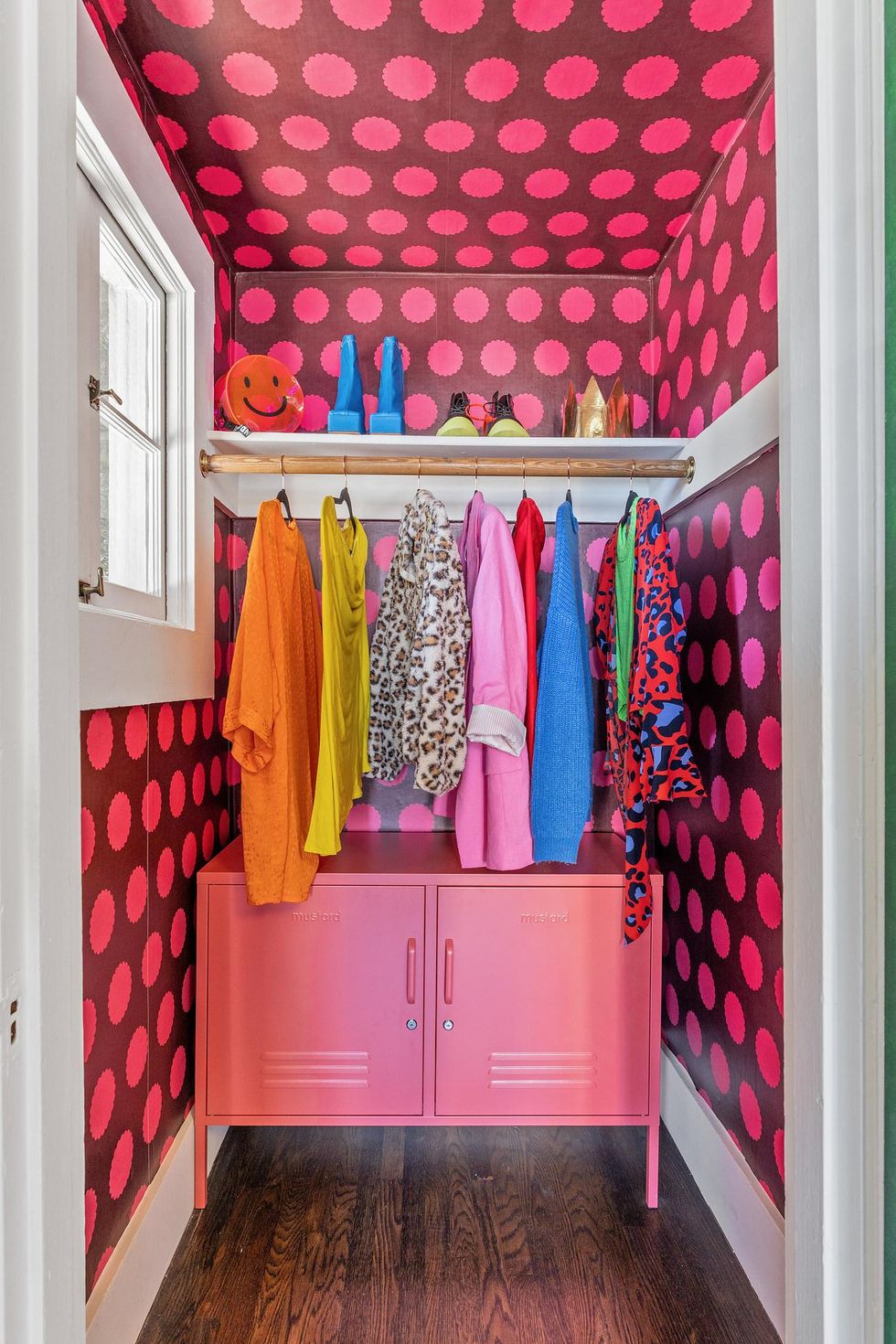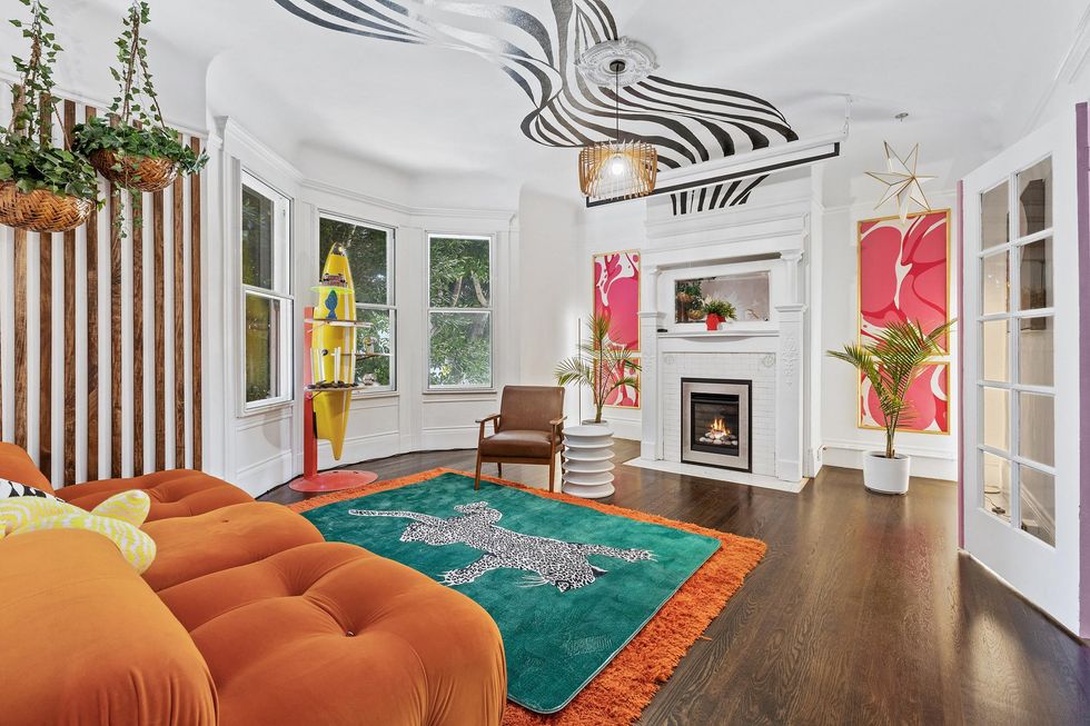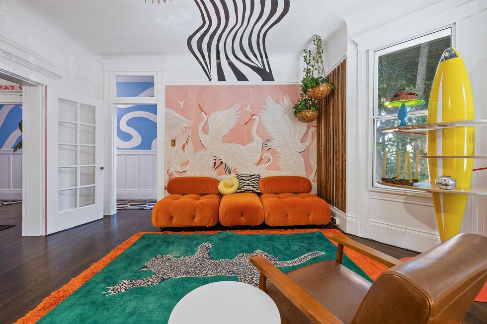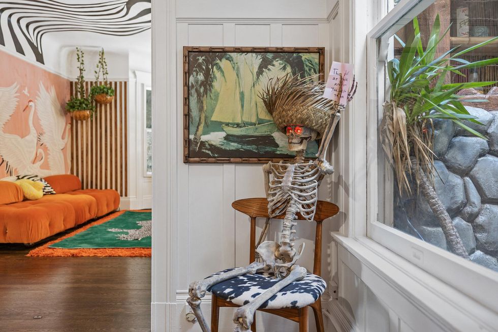 There are polka dots and animal prints and colorful gallery walls, and that's not to mention the furniture which will stay behind with the house. Pieces fuse midcentury and contemporary styles; the standout for design connoisseurs will be Mario Bellini's iconic orange Camaleonda sofa. Funkier types will appreciate a slew of quirky accents: a skeleton wearing a straw hat, disco balls, and hot pink storage lockers.