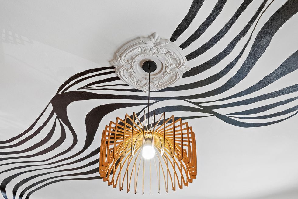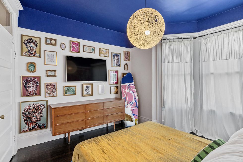 The art and wallpapers, all designed and made by Tay, are quirky and adventurous throughout. In Tay's bedroom, an accent wall is splashed with pattern reminiscent of a lava lamp and a bright blue hue crowns the ceiling. A second bedroom, currently used as a closet, has a lime green ceiling with marbled wallpaper and a faux living wall.
