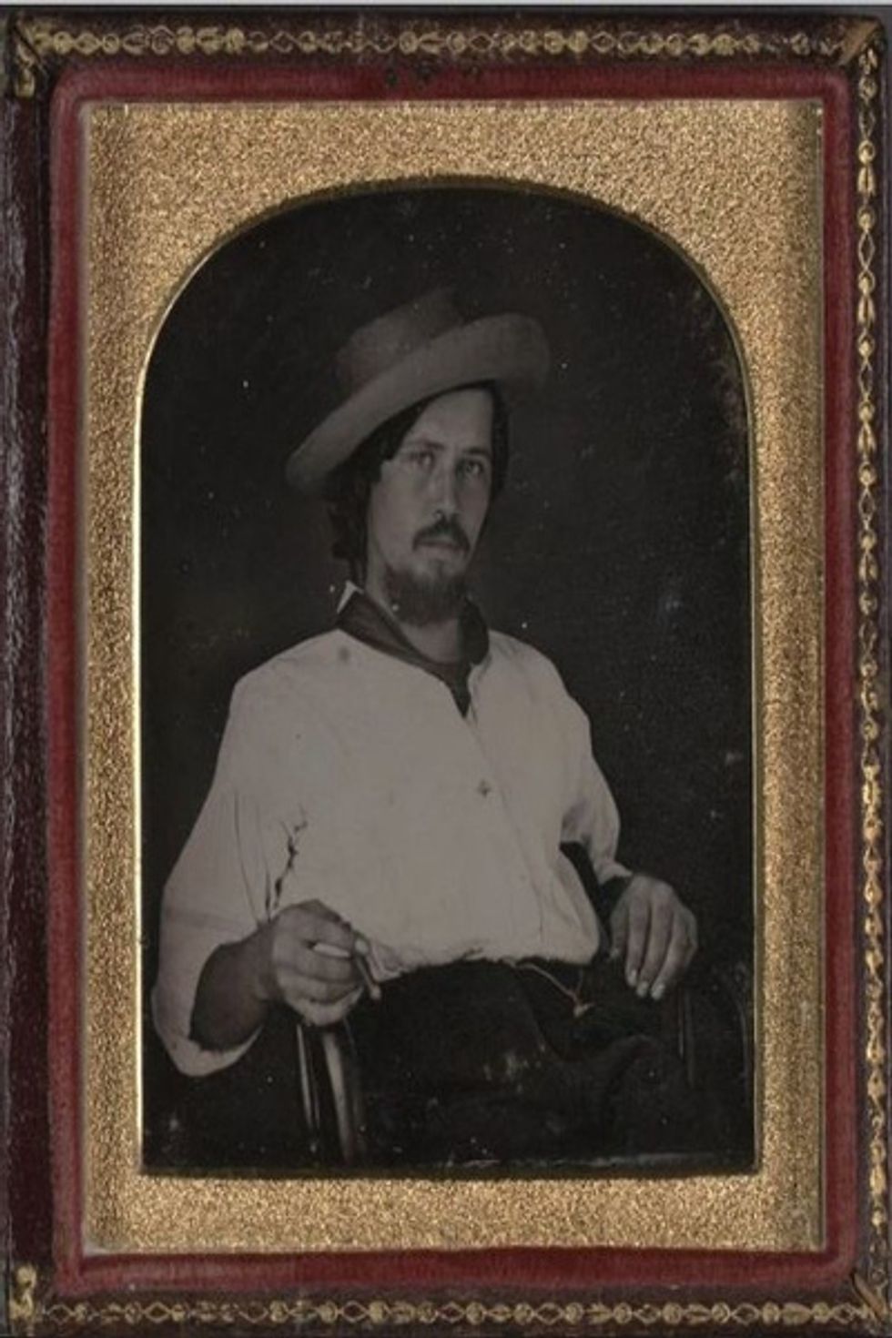 1840s: This daguerreotype, taken sometime between 1848 and 1854, shows an actor by the name of Fulton wearing the style of dress common at the time among Gold Rush miners: an ascot, wide-brimmed hat, and loose-fitting shirt. (via Online Archive of California)