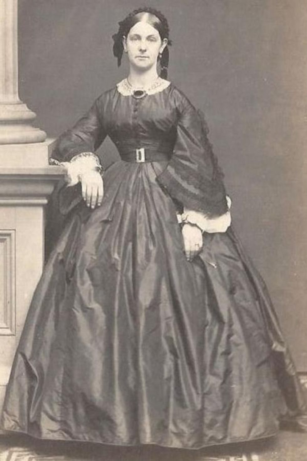 1860s: This photo, showcases the trends of the 1860s: a wide daydress with high neckline, and smooth parted hair made up in a braid with ribbons. (via eBay)