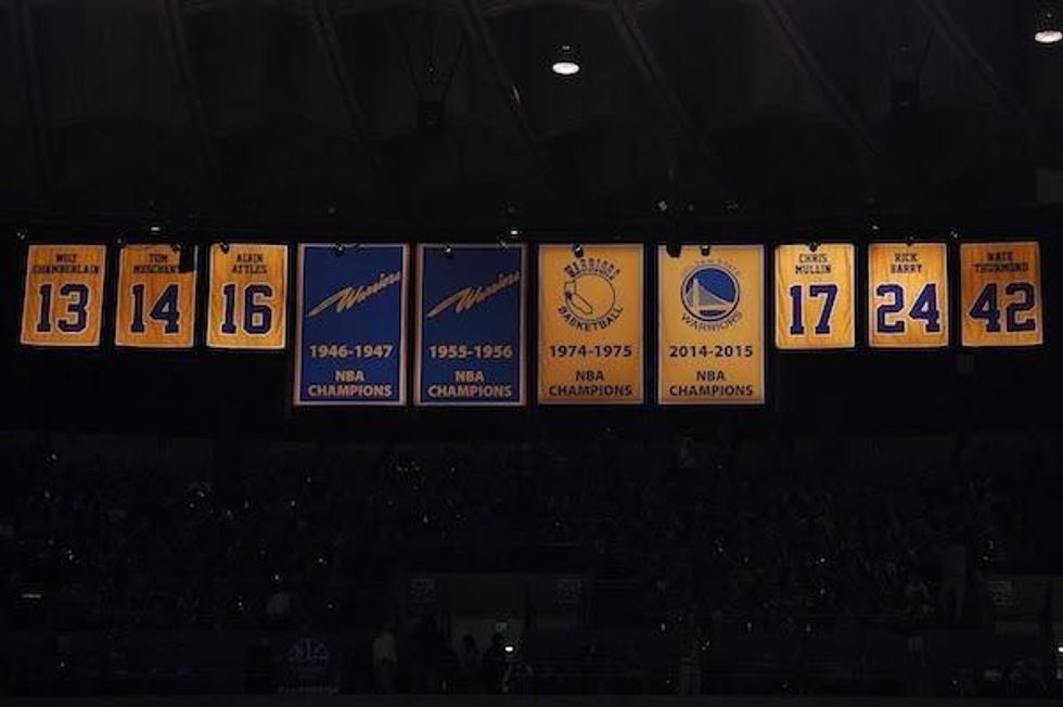 A view of the Golden State Warriors championship banners before the game against the New Orleans Pelicans at Oracle Arena, Oct 27, 2015. (Kyle Terada-USA TODAY Sports via Warriors World)