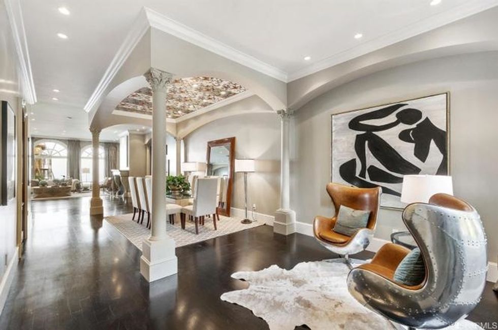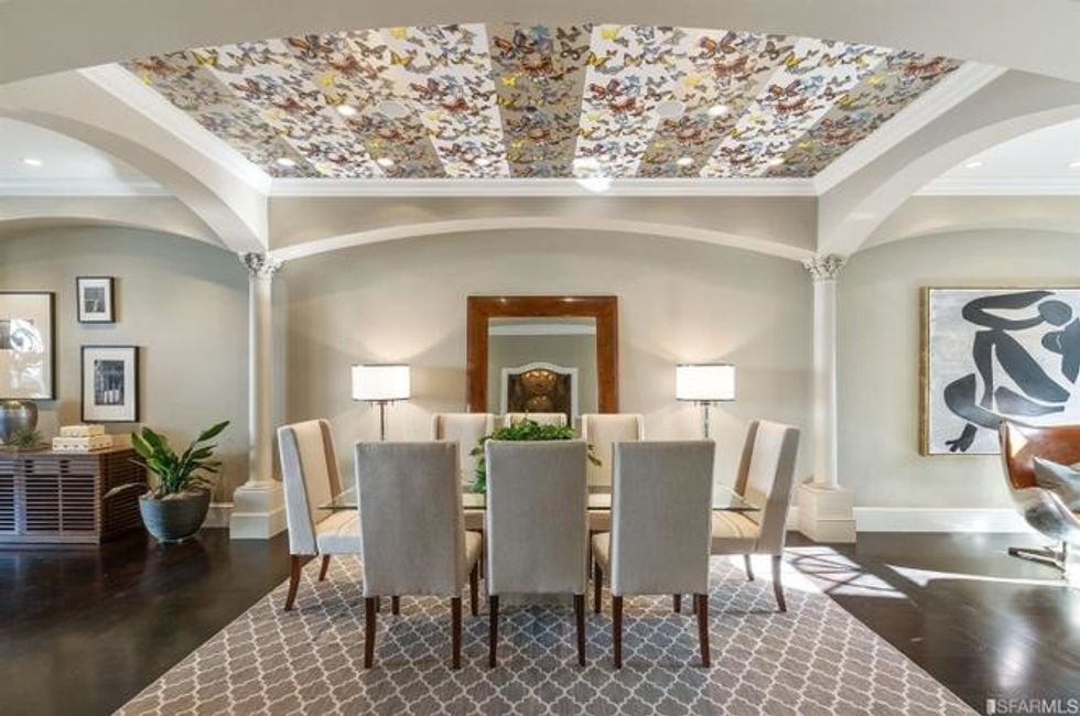 Designed for entertaining, the main level has a spacious living room with a grand fireplace and floor-to-ceiling windows with views of sail boats on the bay. Defined by four columns and custom ceiling artwork (butterflies!), the dining room is a stately space to enjoy a meal, matched only the adjacent full bar that hides out behind two dramatic double doors.