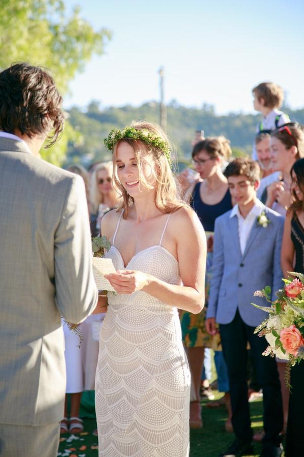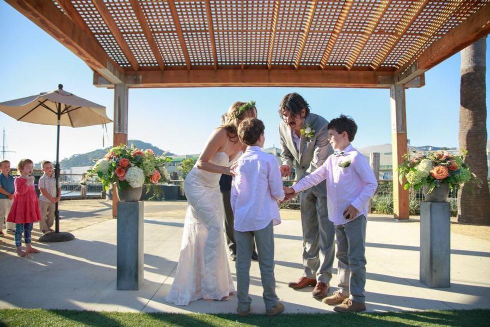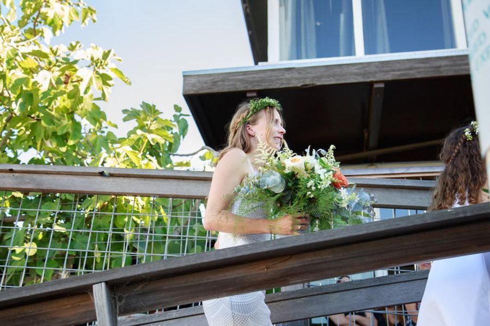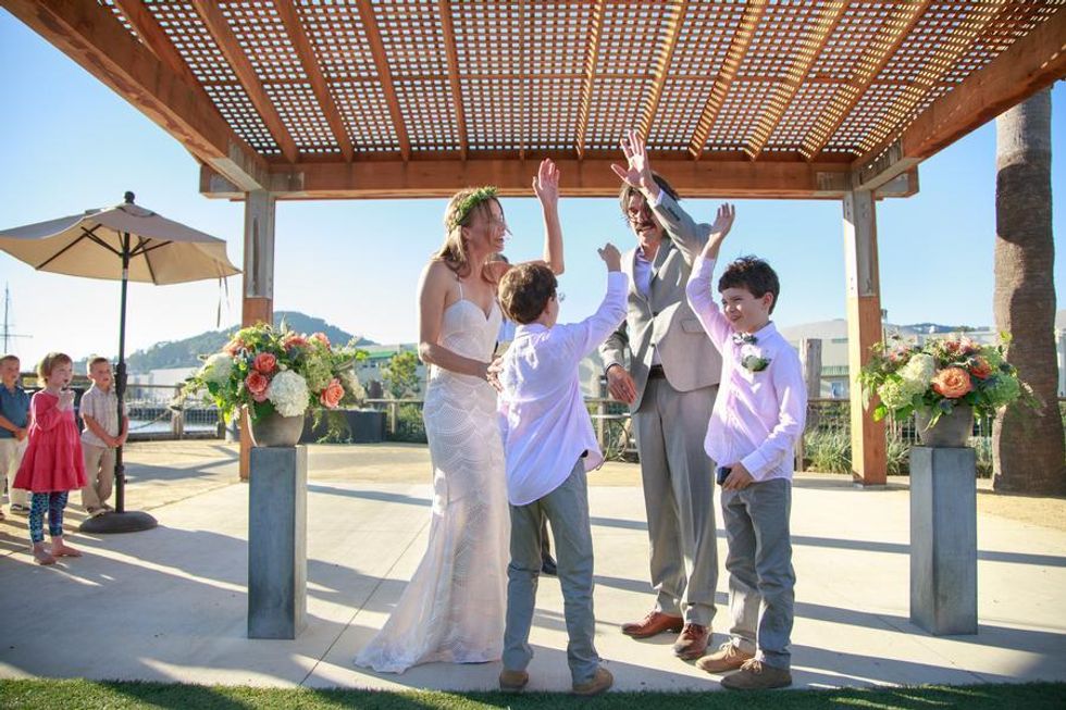 Hosted in the pocket park behind the restaurant, the celebration had all the vibes of a picturesque backyard summer wedding: Karen and Brian exchanged vows beneath a pergola as guests looked on from beneath the palms. Family tunes were at the center of the ceremony, of course—the Terrapin Family Band played at the reception.