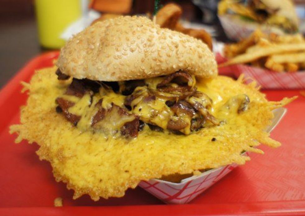 What's a squeezeburger? One of the weirdest, but truly delicious things you might ever eat. The 1/3 pound patty is grilled, topped with perhaps a pound of cheddar then grilled some more, so the cheese goes gooey on top, then spreads and forms a lacy, crisped Saturn skirt all around the meat. The cooks pile on chilled tomato, lettuce, pickles, onions, mayo and mustard, then cap it all with a toasted sesame seed bun. Napkins needed. // 3383 Solano Avenue (Napa) and 211 Peabody Road (Vacaville), squeezeinnhamburgers.com