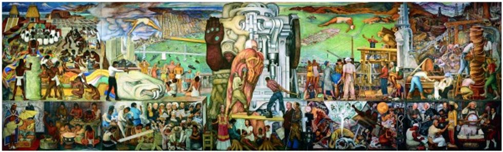He painted Pan-American Unity in the traditional fresco style of the Italian Renaissance. The five panels celebrate the fusion of traditional Latino cultures and modern American innovation and engineering. They tell their own stories, and have names that sound like Sufjan Stevens song titles, like "The Creative Genius of the South Growing from Religious Fervor and the Native Talent for Plastic Expression." The centerpiece is a mesmerizing depiction of the indigenous and modern blending seamlessly: it's half Aztec god Coatlicue, half auto plant stamping machine, and it's incredible.