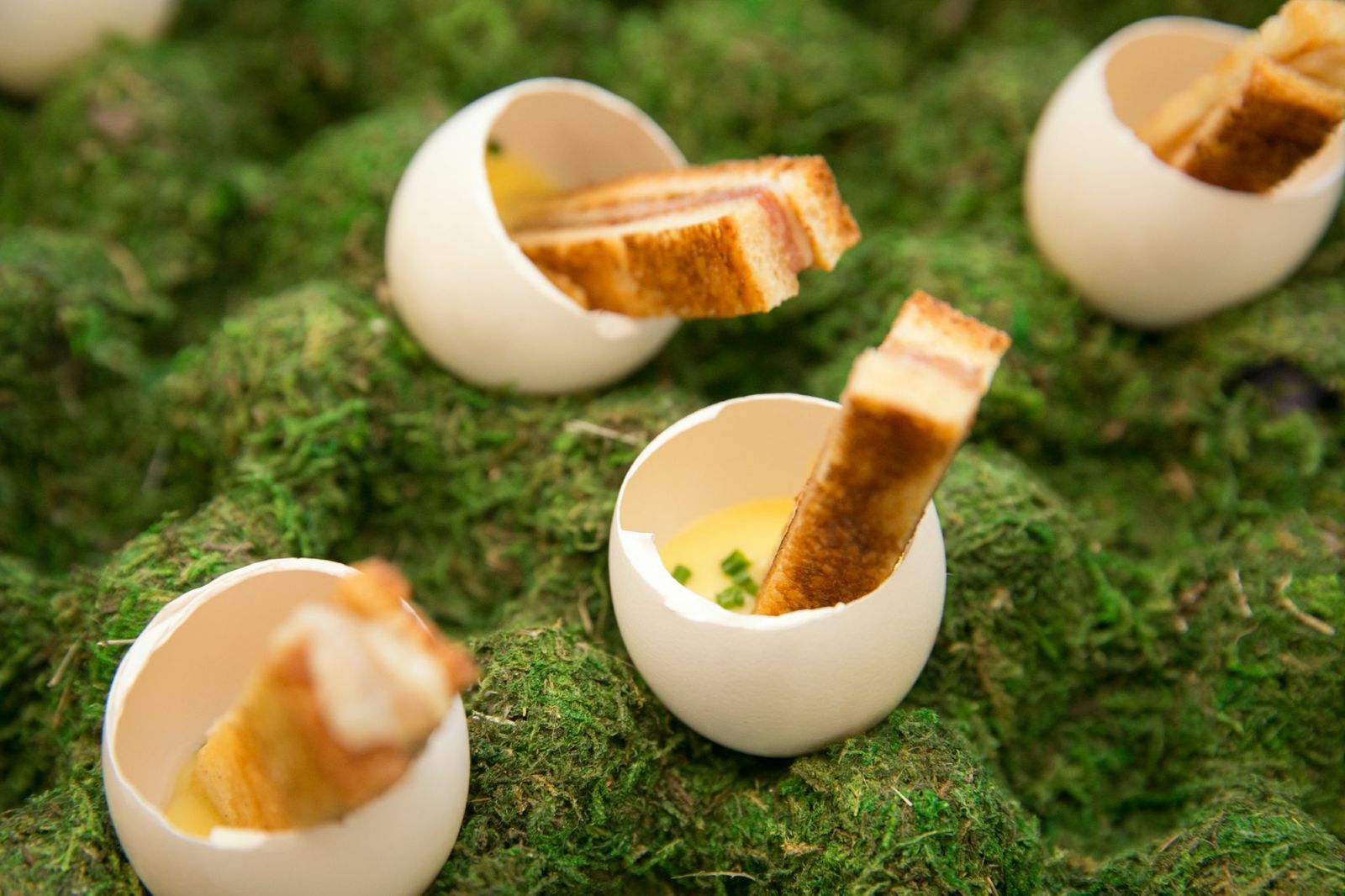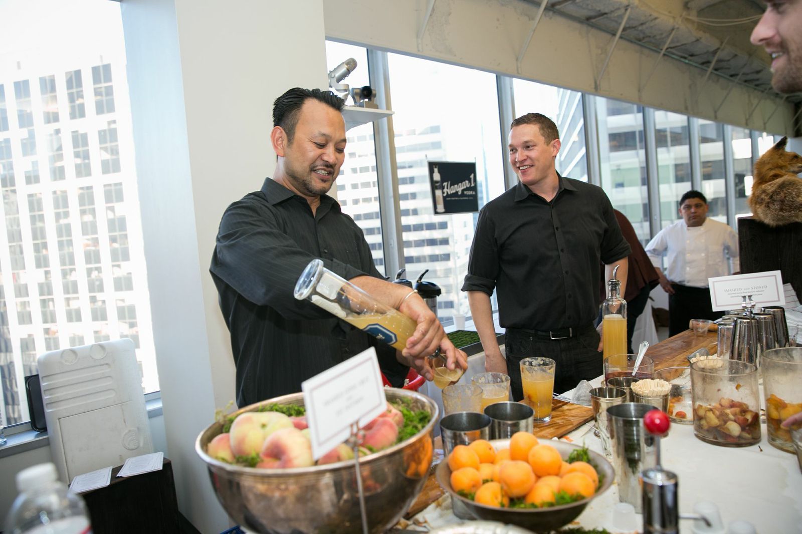 After hunting for the best local farmers market ingredients to infuse their Hangar 1 Vodka, Puccio and Freiberg worked relentlessly to come up with a brand new cocktail fit for a local startup's product launch party. The result: "Smashed & Stoned" made with cherries, white peach, and apricot stones, all smashed for their nutty flavor. Puccio put her culinary prowess to work by preparing delicate ham & cheese soldiers with goat butter hollandaise inside hundreds of hollowed egg shells, as a compliment to the team's bomb new cocktail. Needless to say, Lookout employees were pleased.