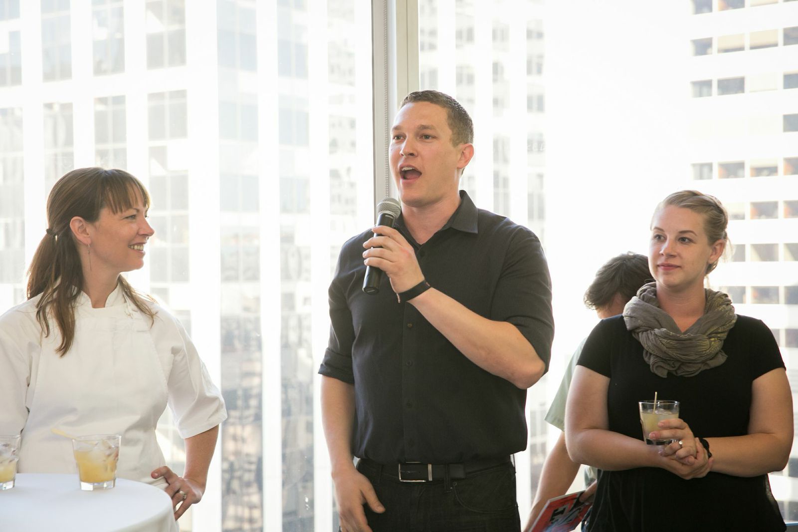 The Cavalier mixologist, Gabriel Freiberg, introducing his Hangar 1 cocktail to the crowd, alongside Head Chef Jen Puccio (left)