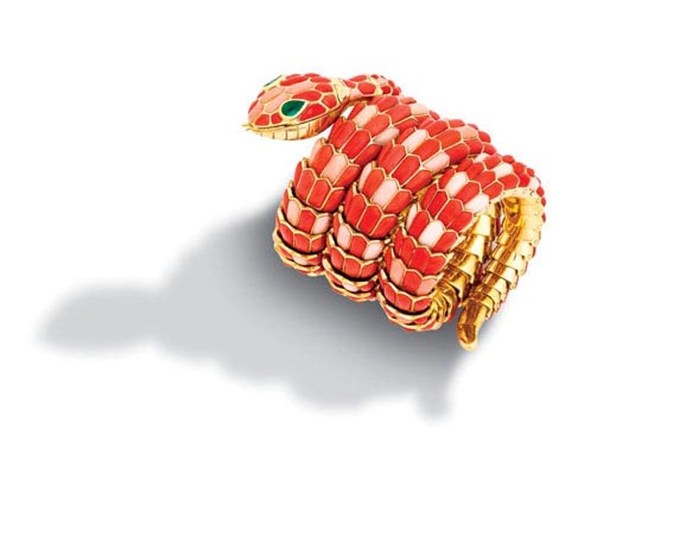 Snake bracelet watch of gold with coral, emeralds, and diamonds, ca. 1965. Private collection. Photo courtesy of Zale Richard Rubins