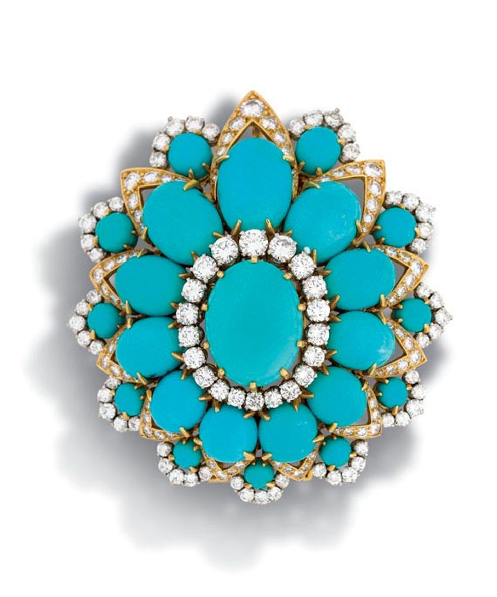 Brooch of platinum with turquoise and diamonds, ca. 1969. Collection of Jennifer Tilly. Photo courtesy of Zale Richard Rubins