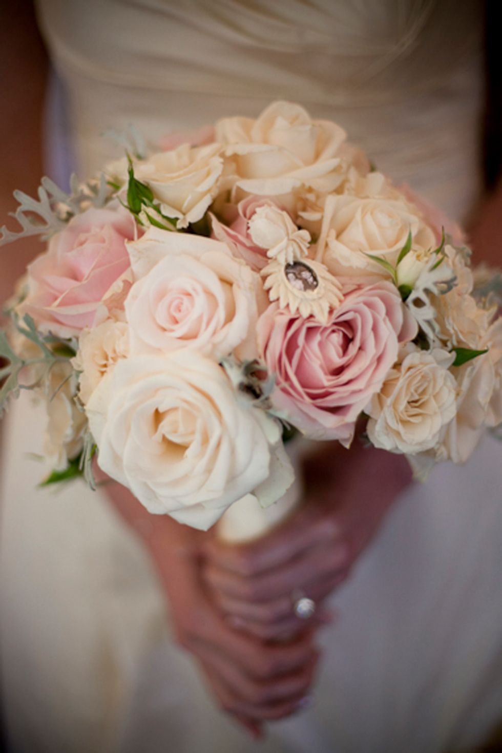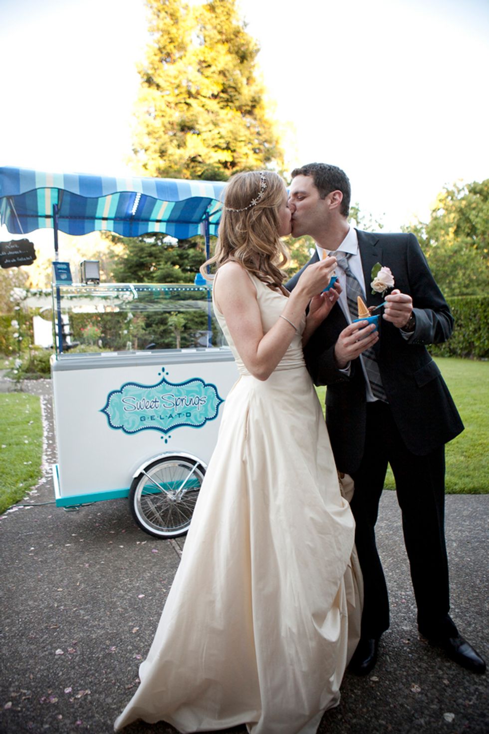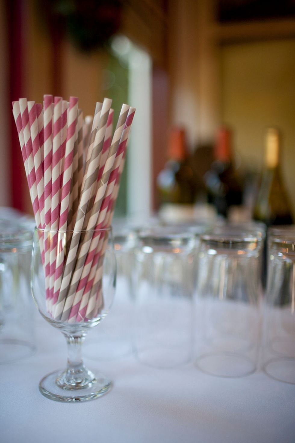 The wedding decorations were full of fun suprises like colorful straws and wine corks for guests to sign. The love birds that topped the cake were a fun play on the typical bride and groom. The soft pinks in the bouqet, dresses and accessories was warm and inviting. With an ice cream cart to finish the sweet celebration, this wedding was full of whit and whimsy.
