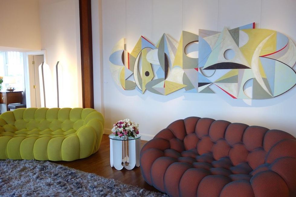 Passionate about art, culture and people, Lebrun-Damiens transformed his residence into a private art gallery. A former dance studio with soaring ceilings, the house is furnished exclusively with Roche Bobois designs: In the dining room, for instance, there are two colorful egg-shaped armchairs, and the living room features the brand's iconic Bubble sofas. "When I moved here we asked Roche Bobois to place their furniture in the Residence. We wanted to highlight all the beauty that France has to offer," he says.