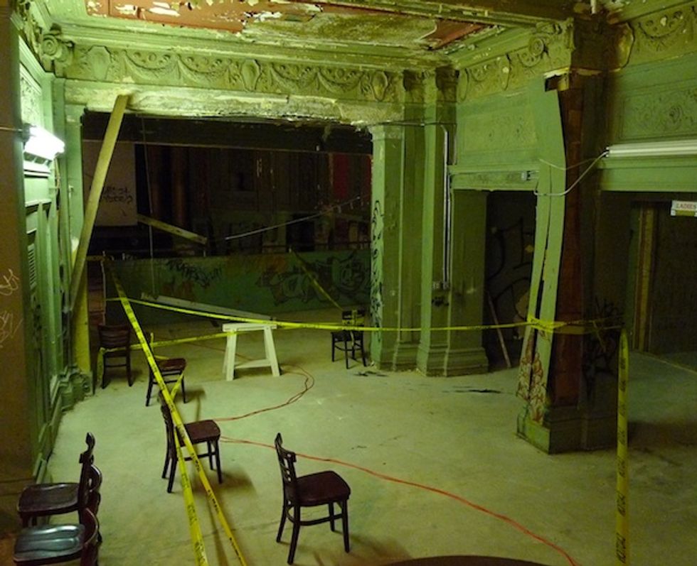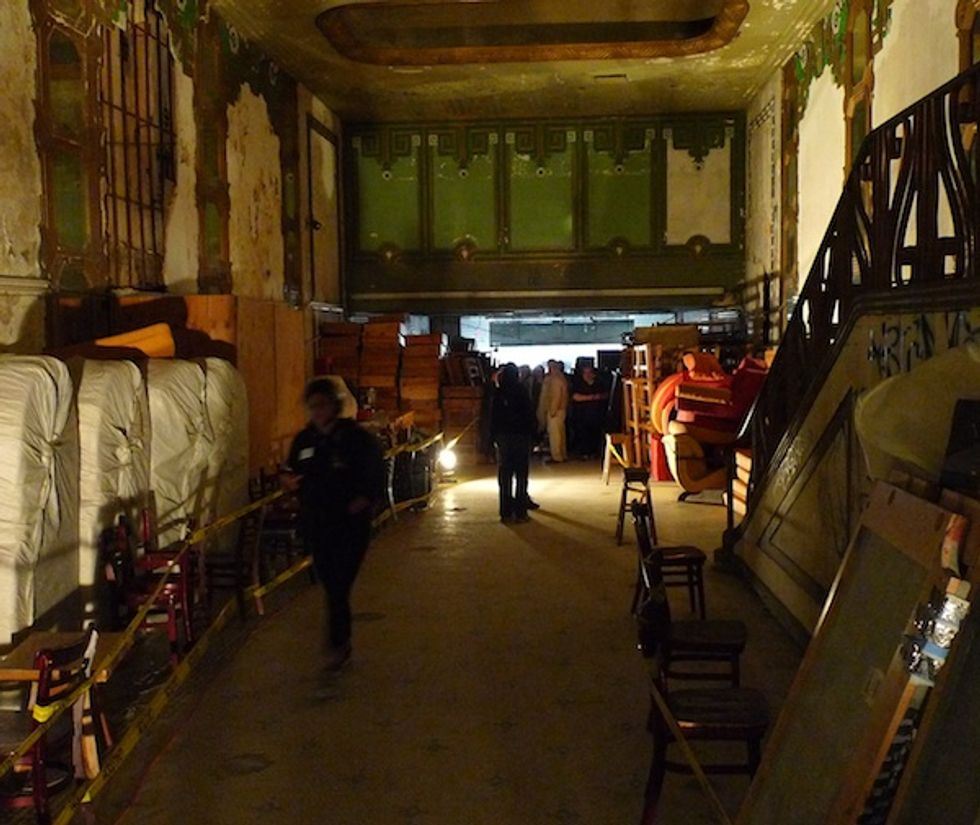 As you can see from the pictures, they've got their work cut out for them, and accordingly detailed architectural plans were in evidence at yesterday's meeting: If built out as promised, the Drafthouse will have five auditoriums, one large one in the original main space seating about 360 people, and four smaller theaters built out along an extended version of the existing balcony at around 40 seats each. When can we expect this marvel? Builders present at the meeting set hopes at a year and change, but with a project of this scale only time will tell.